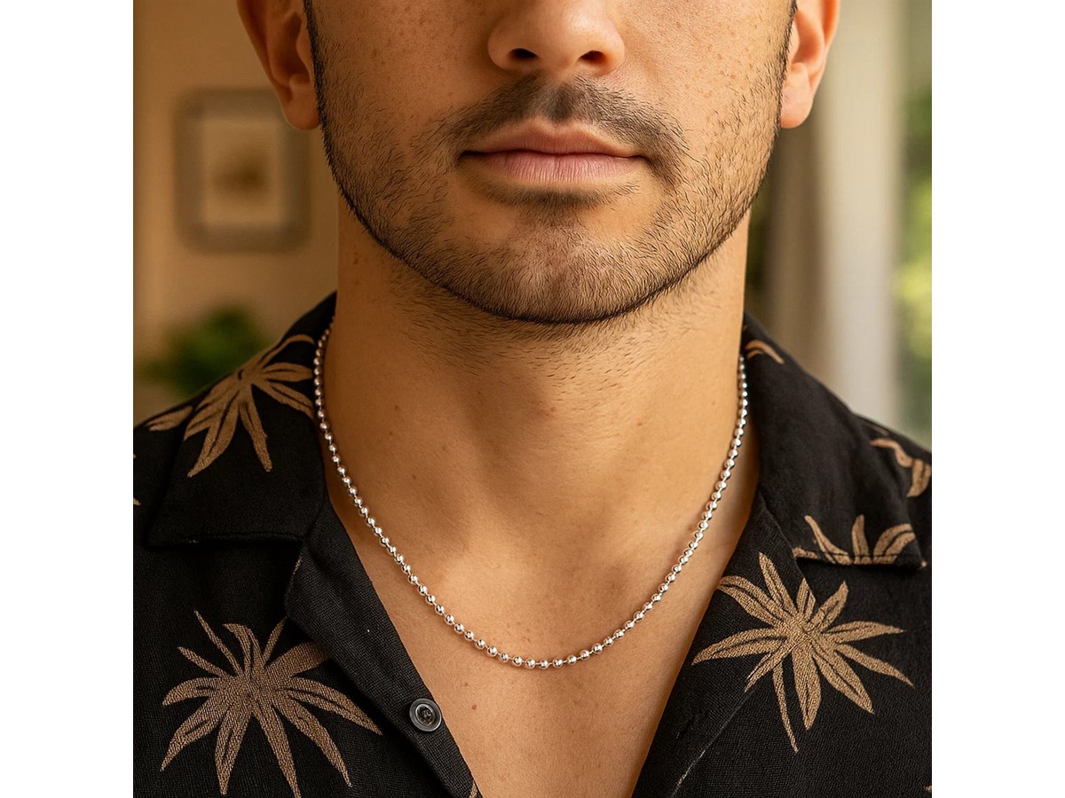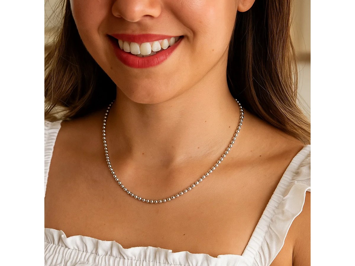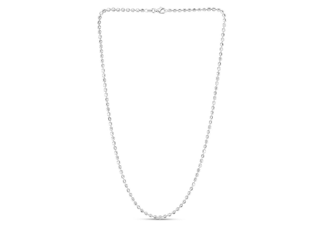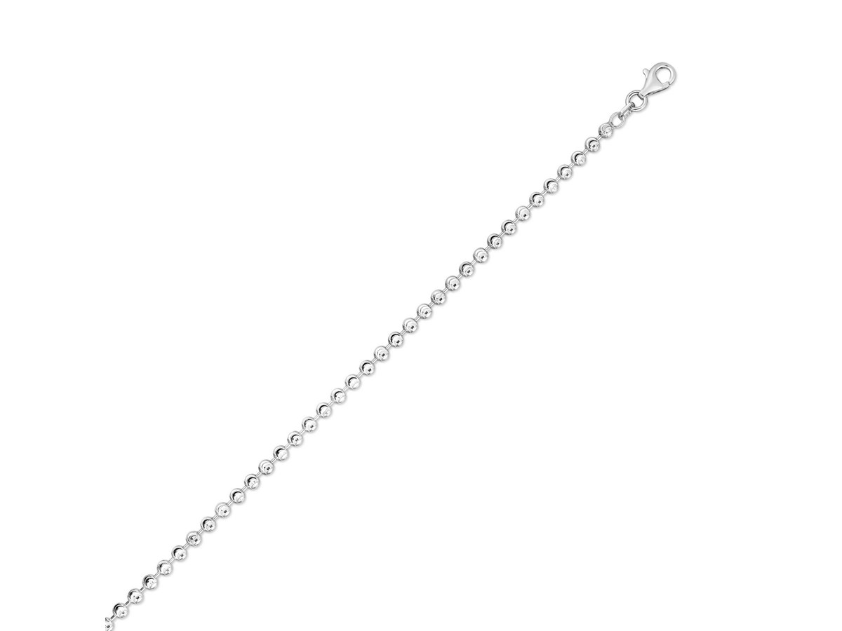 Crafted in sterling silver with a sleek rhodium finish, this 3.00 mm moon cut bead chain features finely faceted beads that shimmer with every movement, offering a radiant, eye-catching sparkle in a durable, elegant design perfect for wearing alone or pairing with your favorite pendant.