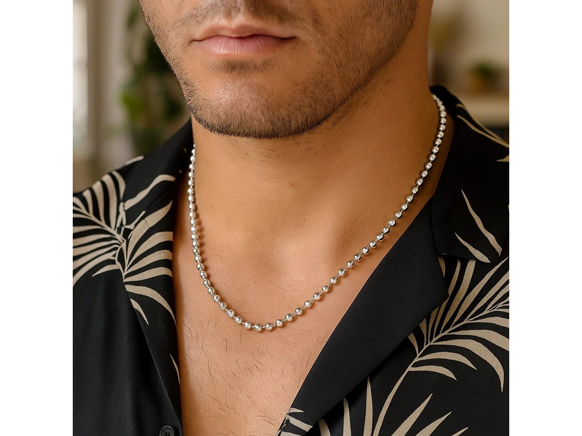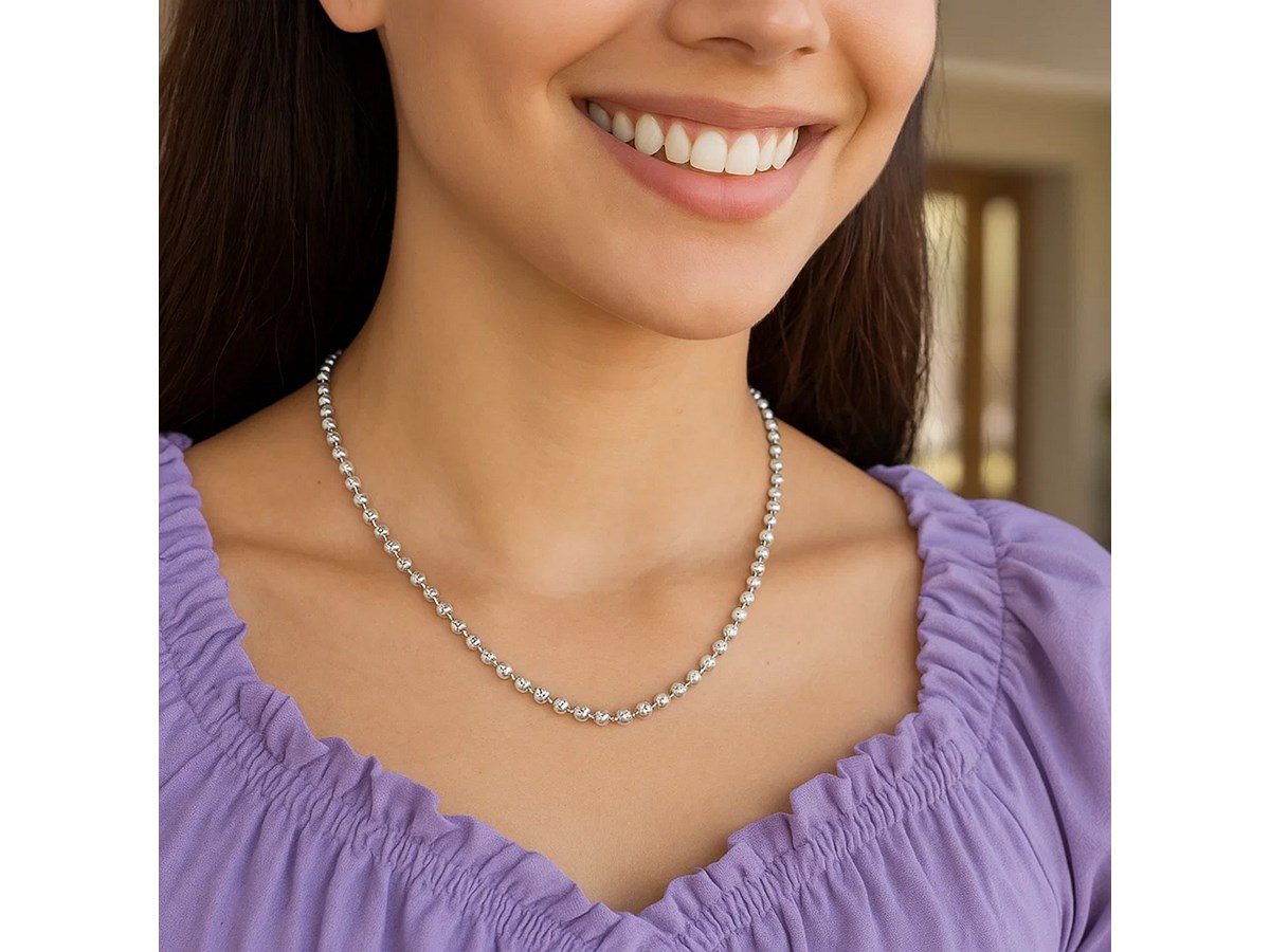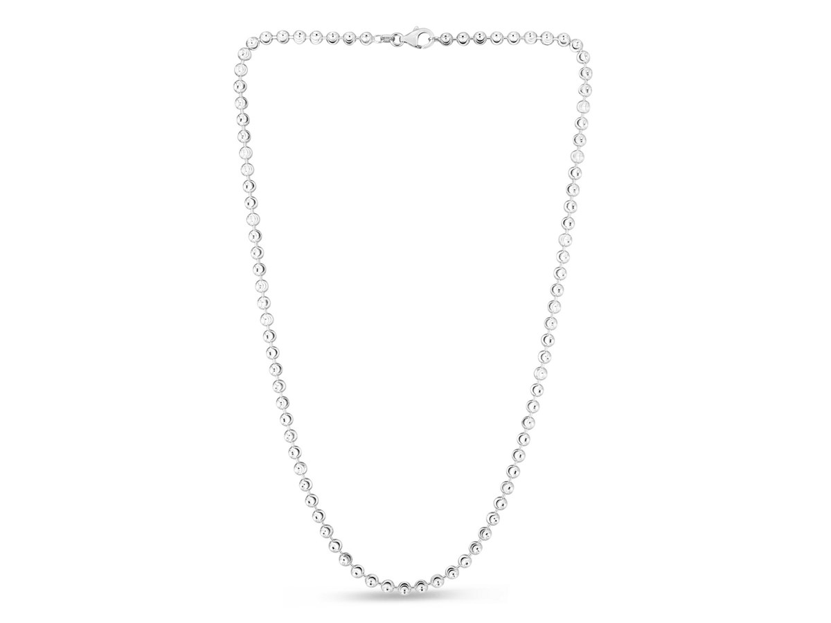 Crafted in sterling silver and finished with a bright rhodium plating, this 4.00 mm moon cut bead chain showcases larger, faceted beads that deliver striking brilliance and bold texture, creating an eye-catching statement piece perfect for wearing solo or enhancing with a standout pendant.