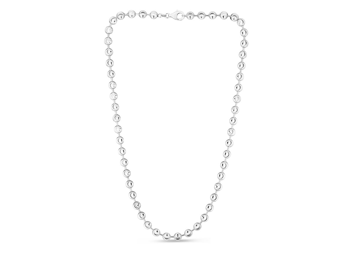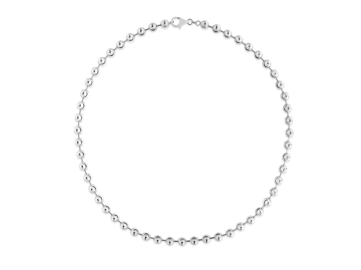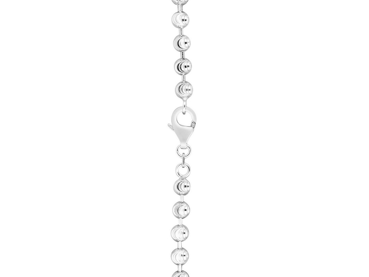 Crafted in sterling silver and finished with a bright rhodium plating, this 6.00 mm moon cut bead chain showcases larger, faceted beads that deliver striking brilliance and bold texture, creating an eye-catching statement piece perfect for wearing solo or enhancing with a standout pendant.