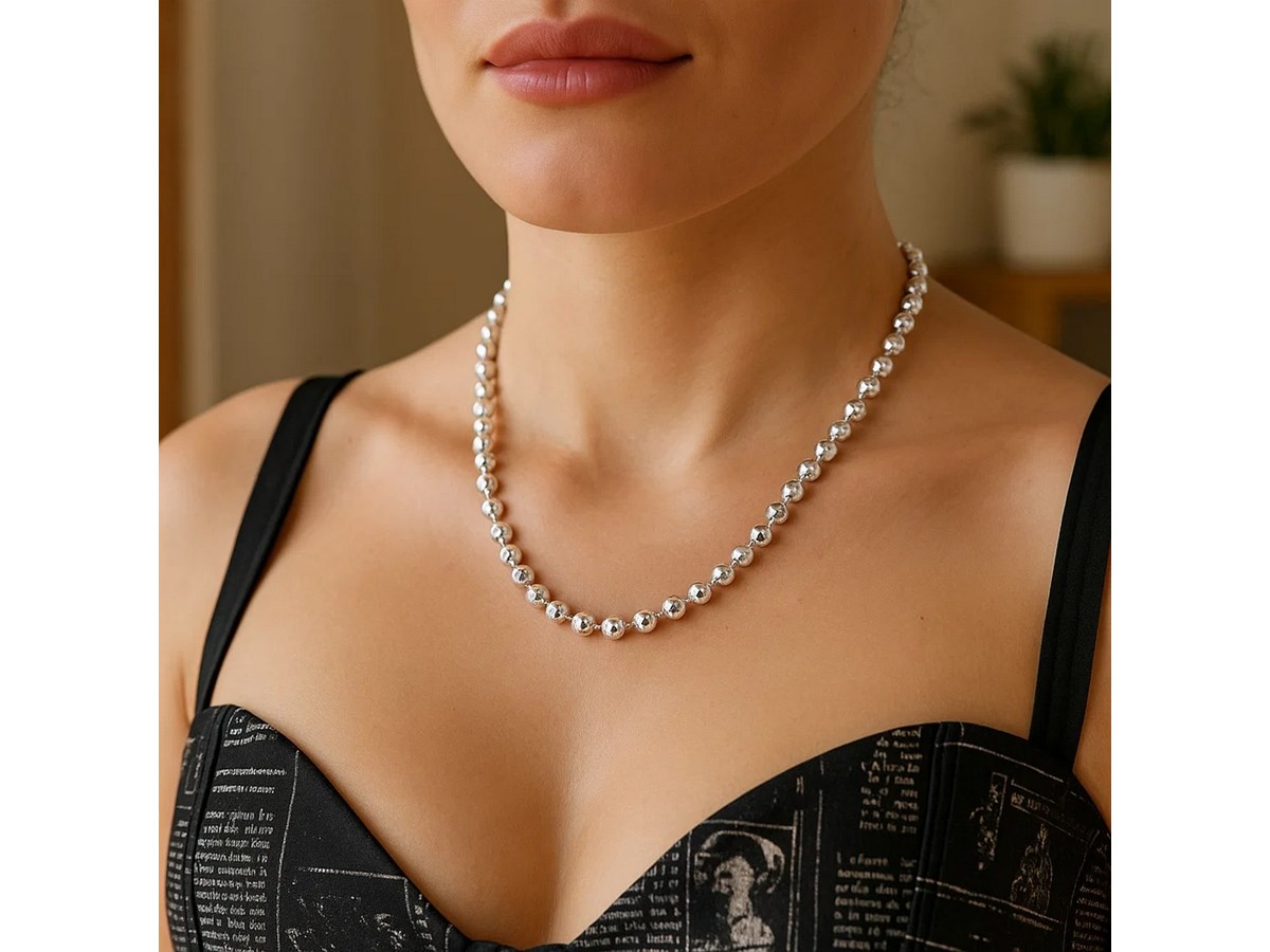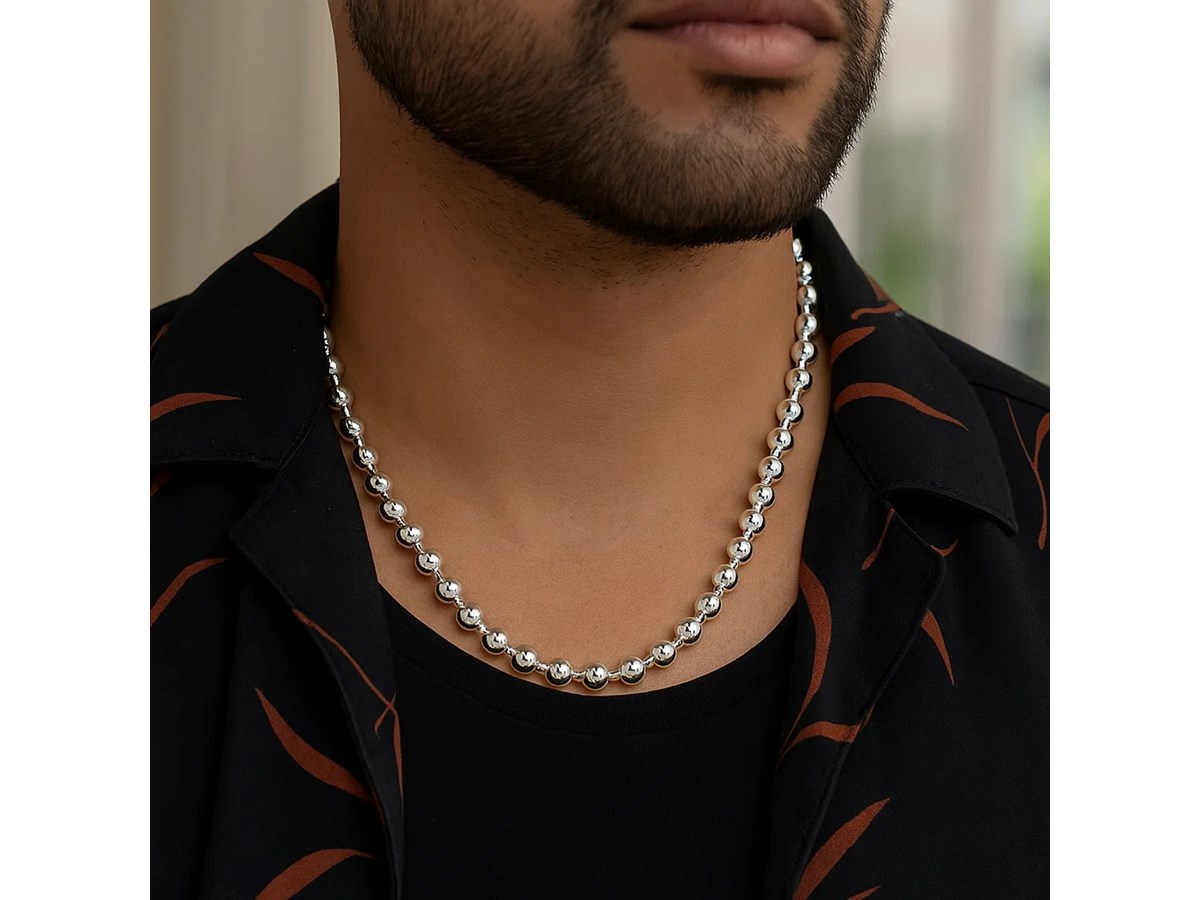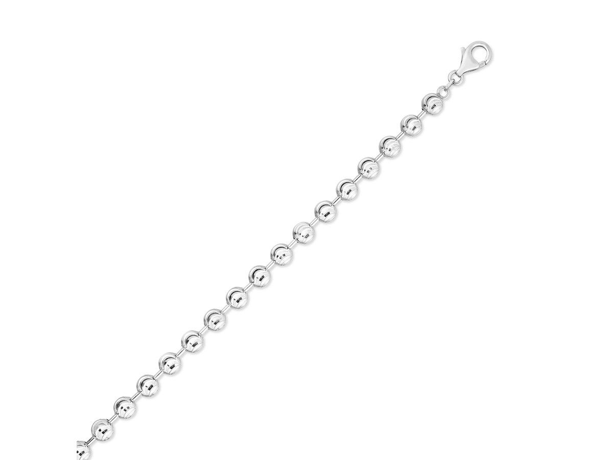 Crafted in sterling silver and finished with a bright rhodium plating, this 6.00 mm moon cut bead chain showcases larger, faceted beads that deliver striking brilliance and bold texture, creating an eye-catching statement piece perfect for wearing solo or enhancing with a standout pendant.