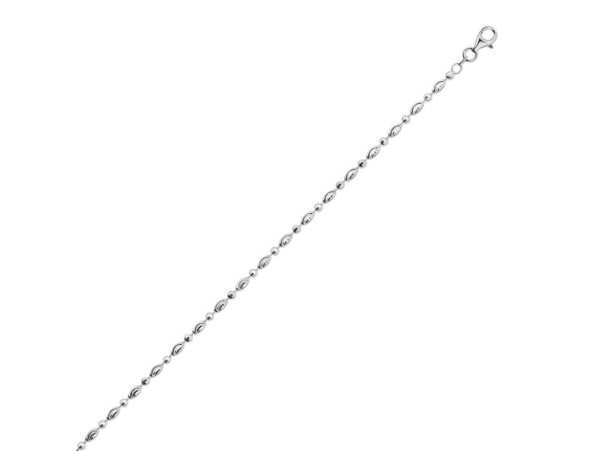 Crafted in sterling silver with a sleek rhodium finish, this 2.50 mm moon cut oval bead chain features shimmering, faceted oval beads that catch the light beautifully, offering an elegant blend of texture and sparkle perfect for wearing on its own or pairing with a favorite pendant.