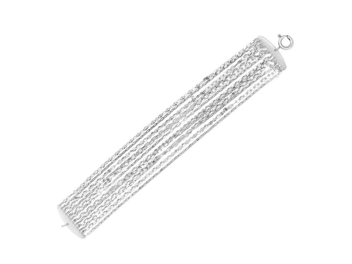 This sterling silver rhodium plated multi strand chain bracelet features layered polished chains that create a bold, textured look. Its bright shine and modern style make it perfect for everyday wear, stacking, or gifting.