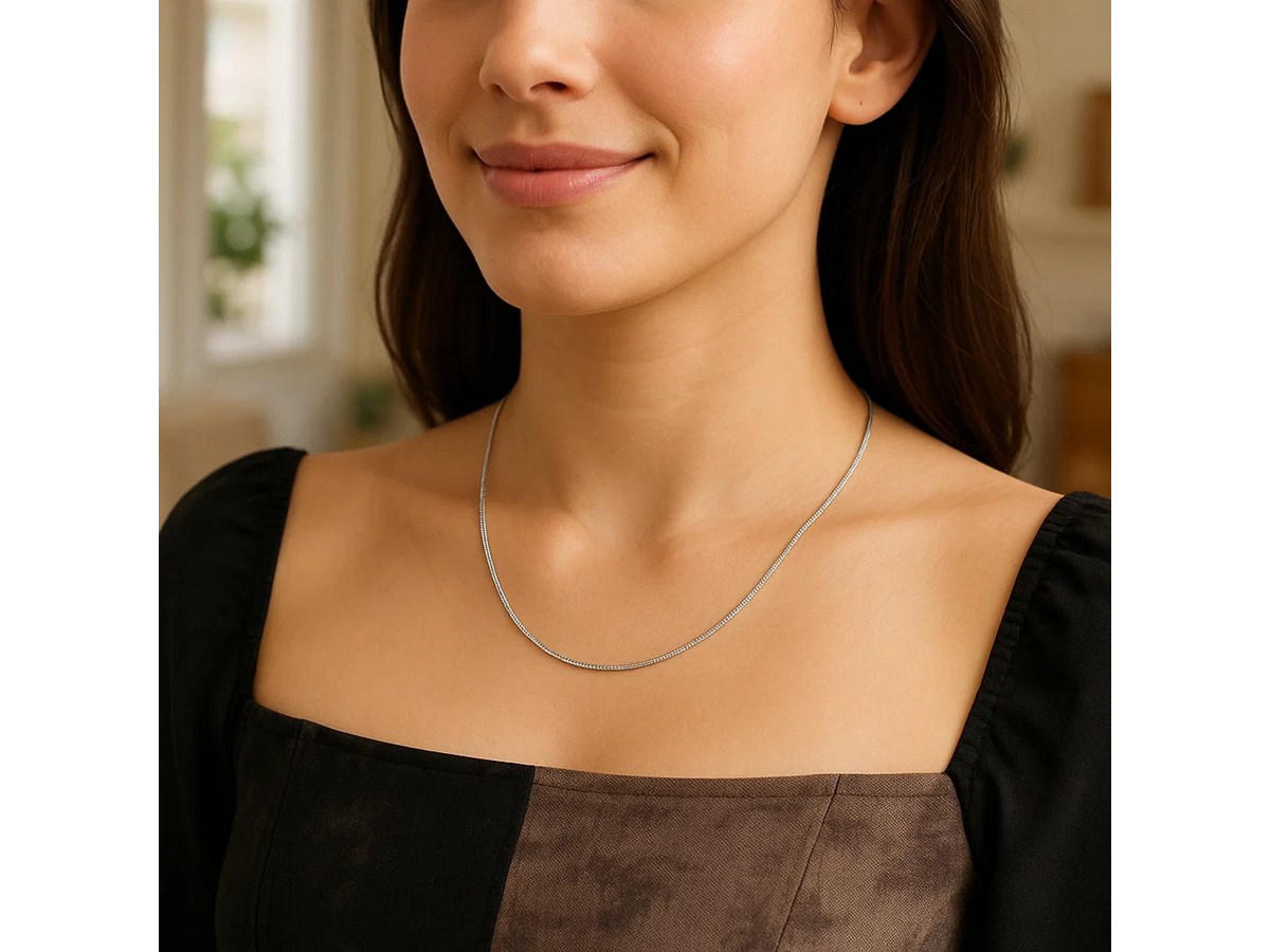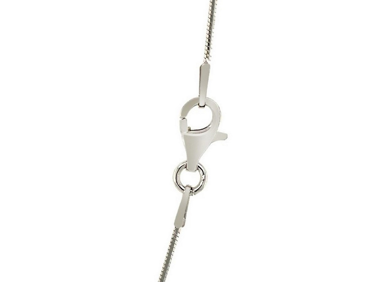 Rhodium plated octagonal snake chain crafted in sterling silver measuring 1.10 millimeters in width. Available in lengths 16 inches, 18 inches, 20 inches and 24 inches.