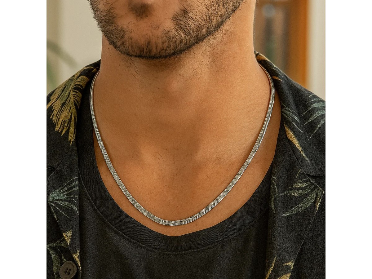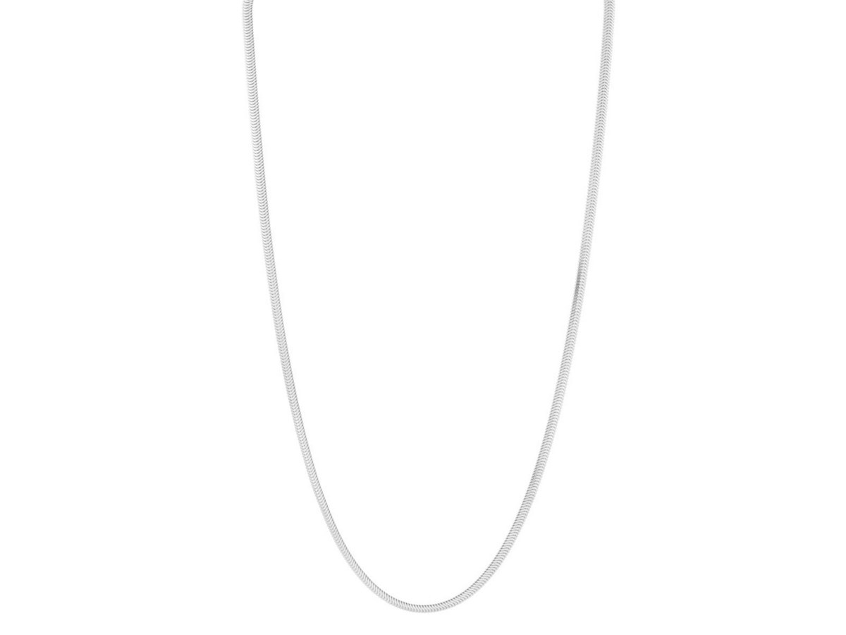 Crafted in sterling silver with a sleek rhodium finish, this 3.30 mm oval snake chain features smooth, elongated links that create a flexible, fluid drape and a bright, polished shine, making it a versatile accessory perfect for everyday wear or pairing with your favorite pendant.