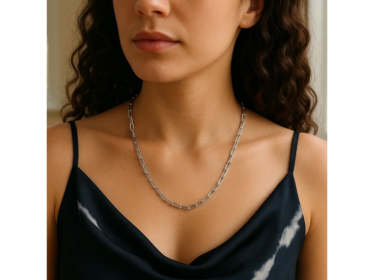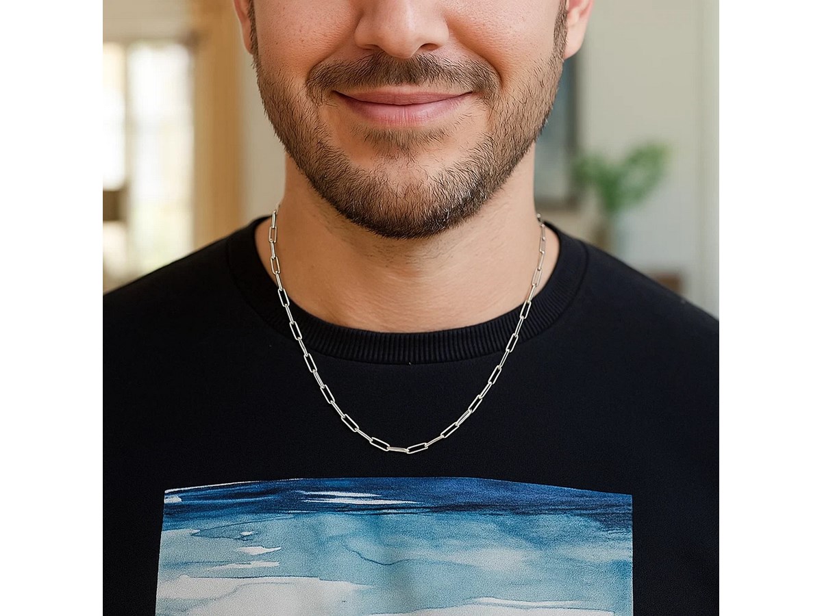 Brilliantly shiny sterling silver links come together to form this contemporary paperclip chain measuring 2.5 mm in width and closes with a lobster clasp. Available in lengths 16, 18, 20 and 24 inches.