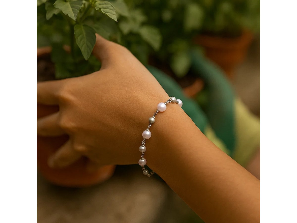 This sterling silver rhodium plated pearl bead bracelet features lustrous faux pearls accented by a sleek, polished silver finish. Its elegant, timeless style makes it perfect for everyday sophistication, special occasions, or gifting.