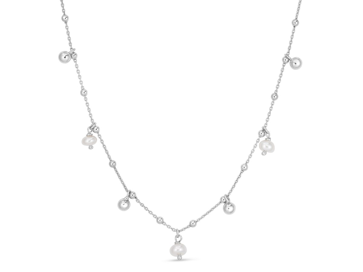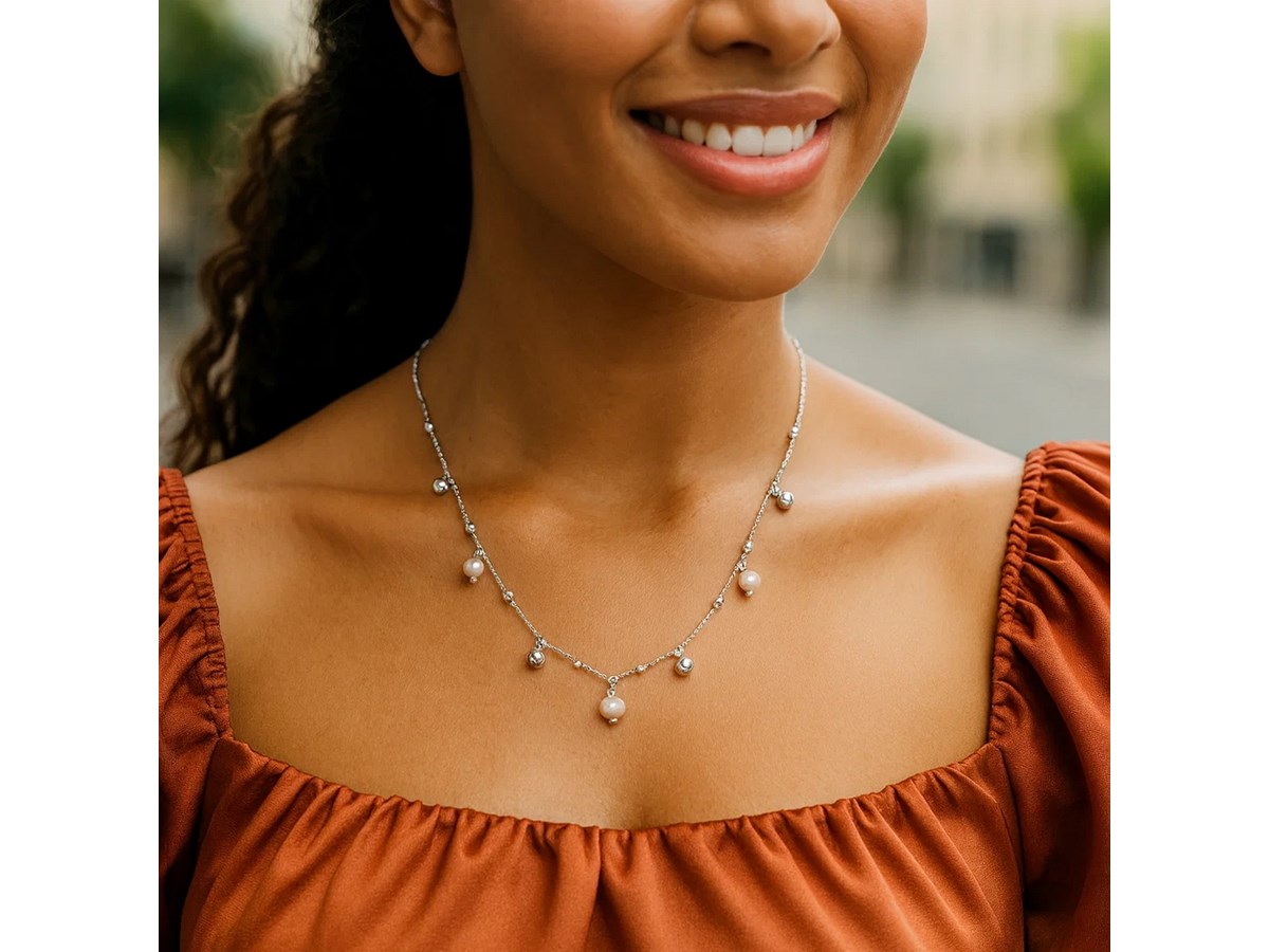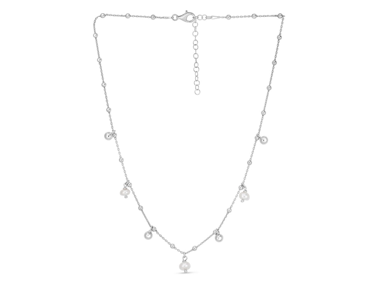 This charming necklace features luminous pearls stationed along a sleek rhodium-plated sterling silver chain, offering a delicate and elegant touch that’s perfect for everyday wear or layering.