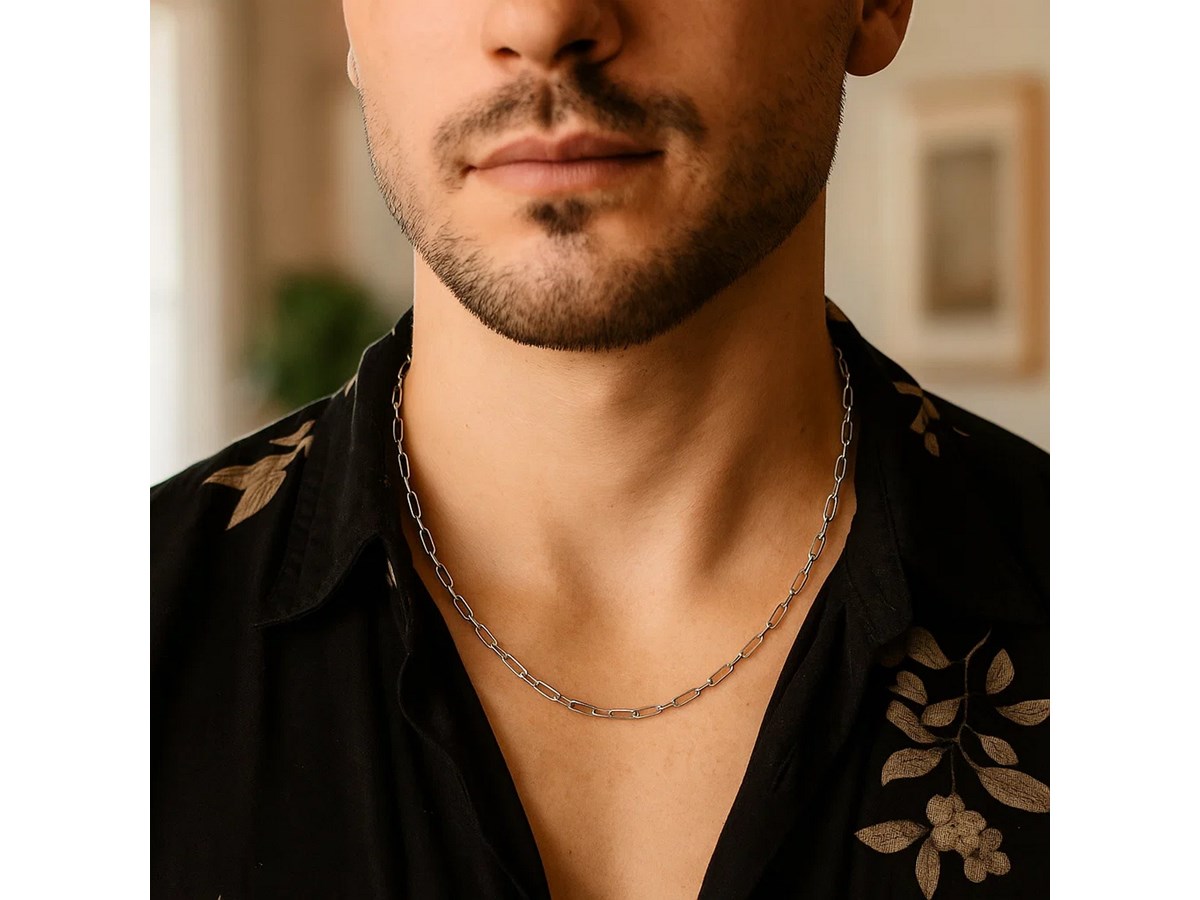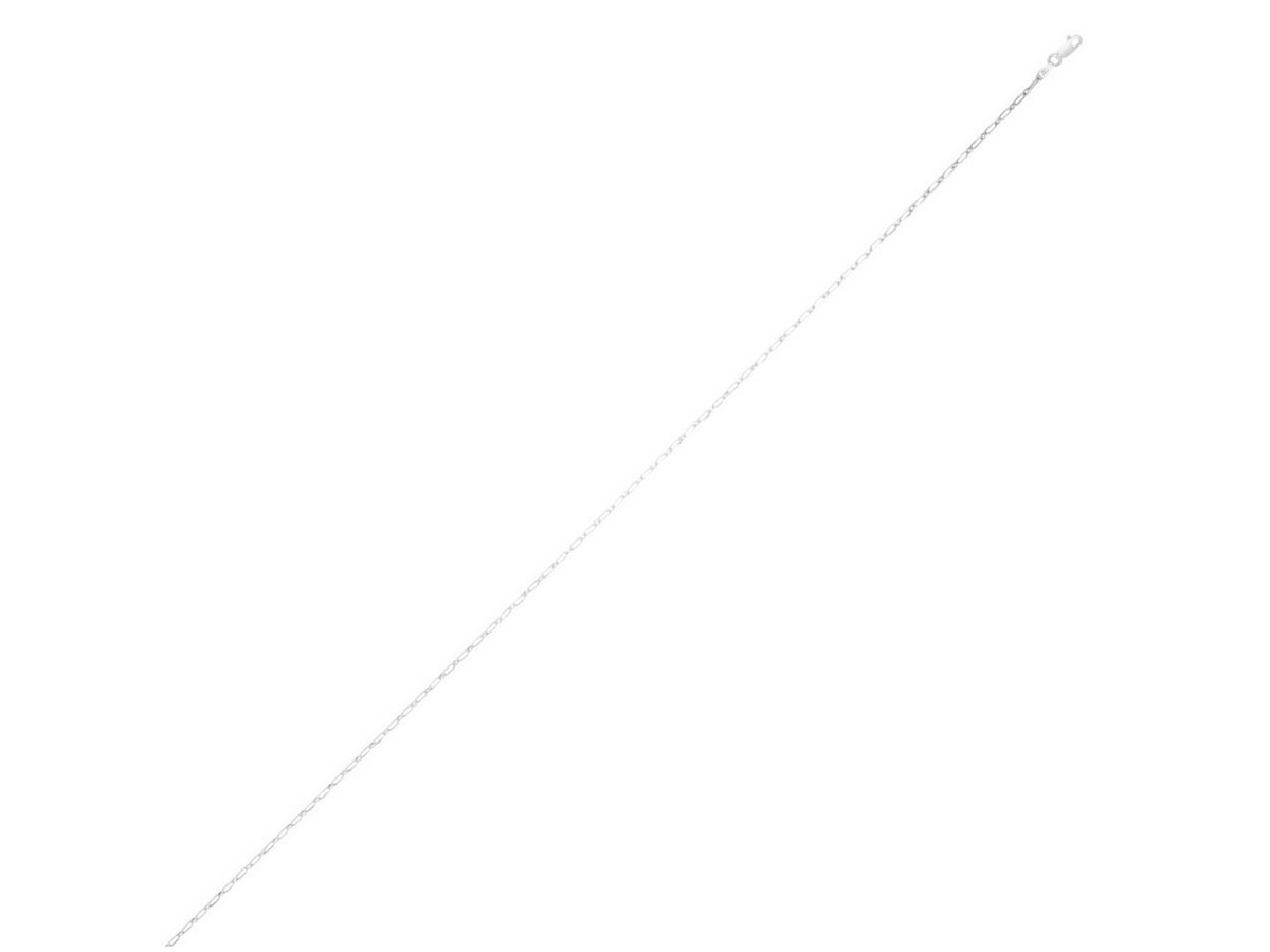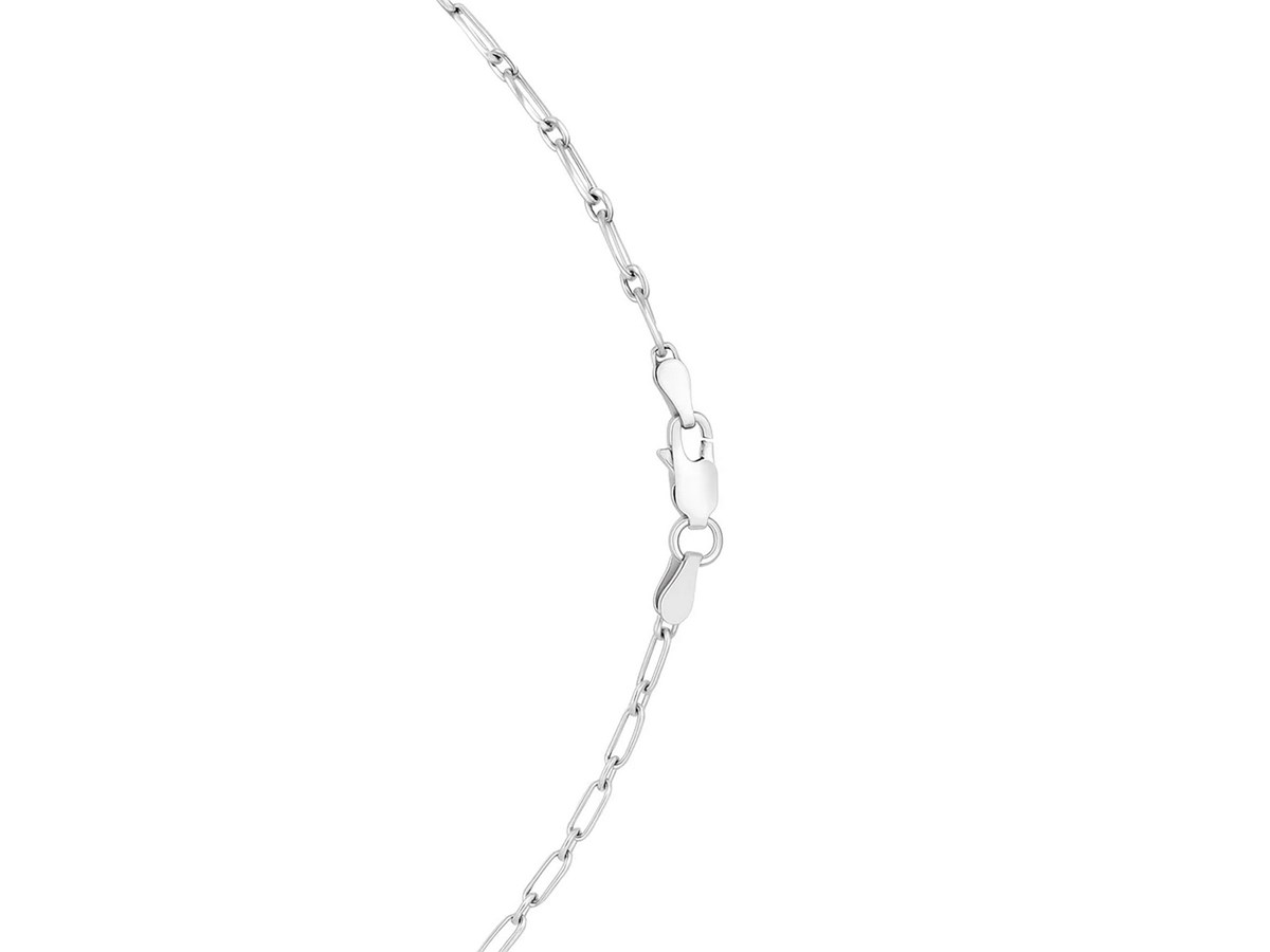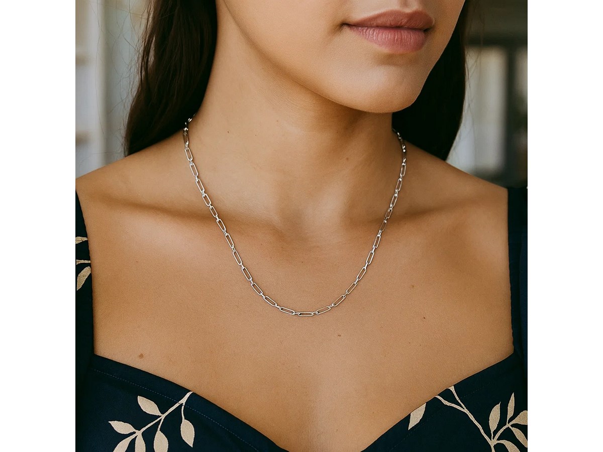 Crafted in sterling silver with a sleek rhodium finish, this 2.30 mm petite alternating paperclip chain features a refined mix of slim and slightly elongated links, offering a modern, lightweight look with polished shine—perfect for everyday wear, delicate layering, or pairing with a small pendant.