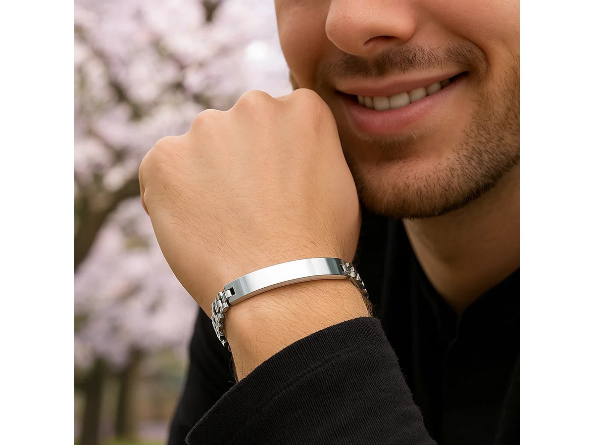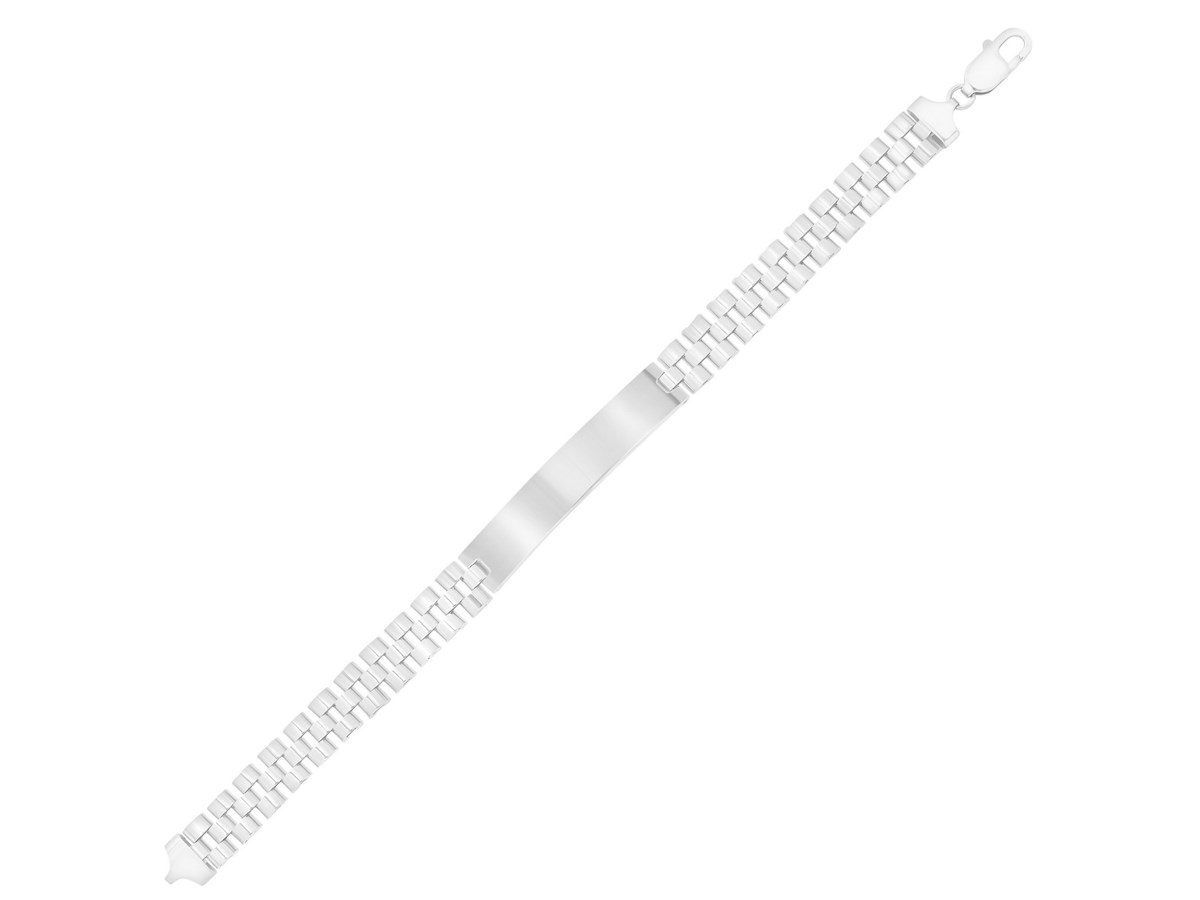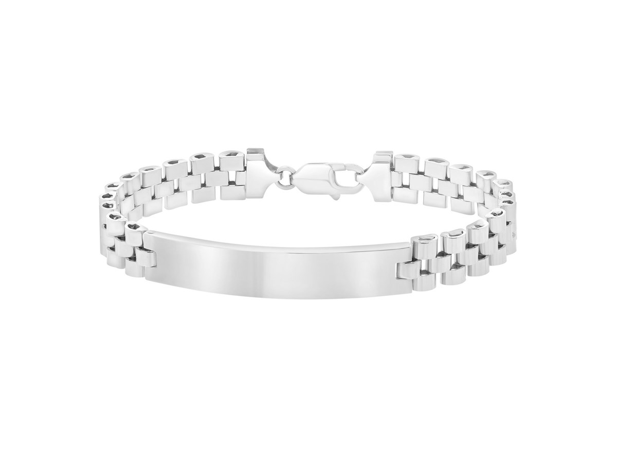 Sleek and modern, this Sterling Silver Rhodium Plated Railroad Chain ID Bracelet offers a bold yet refined look. The railroad chain design adds unique texture and dimension, while the rhodium plating provides lasting shine and tarnish resistance. Finished with a smooth ID plate, it’s perfect for everyday wear and makes a stylish, contemporary addition to any jewelry collection.