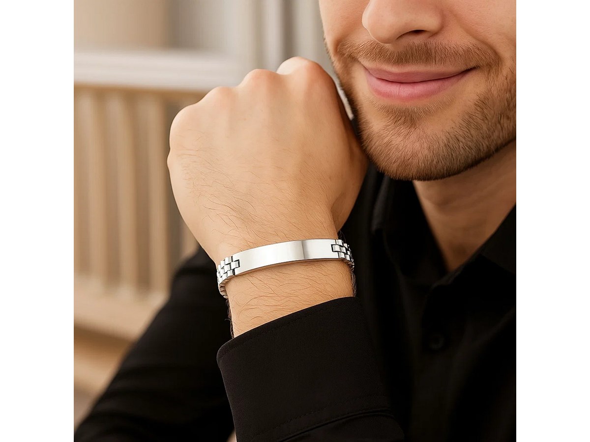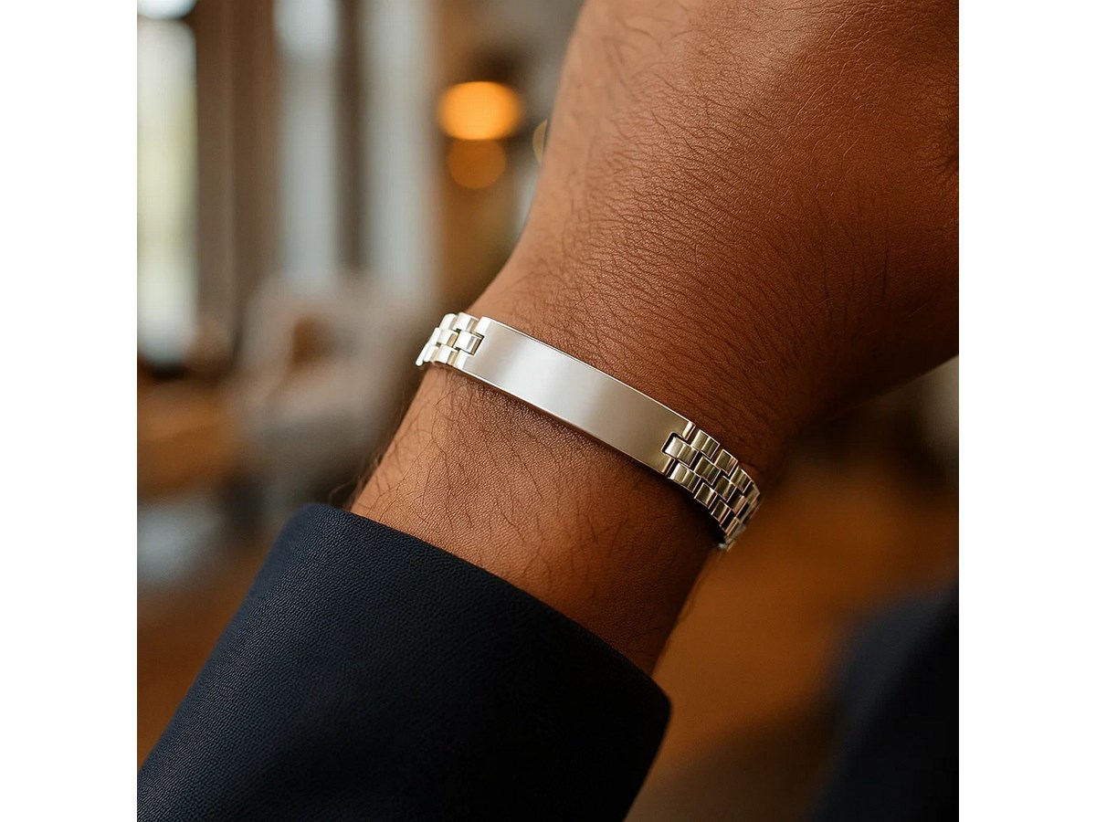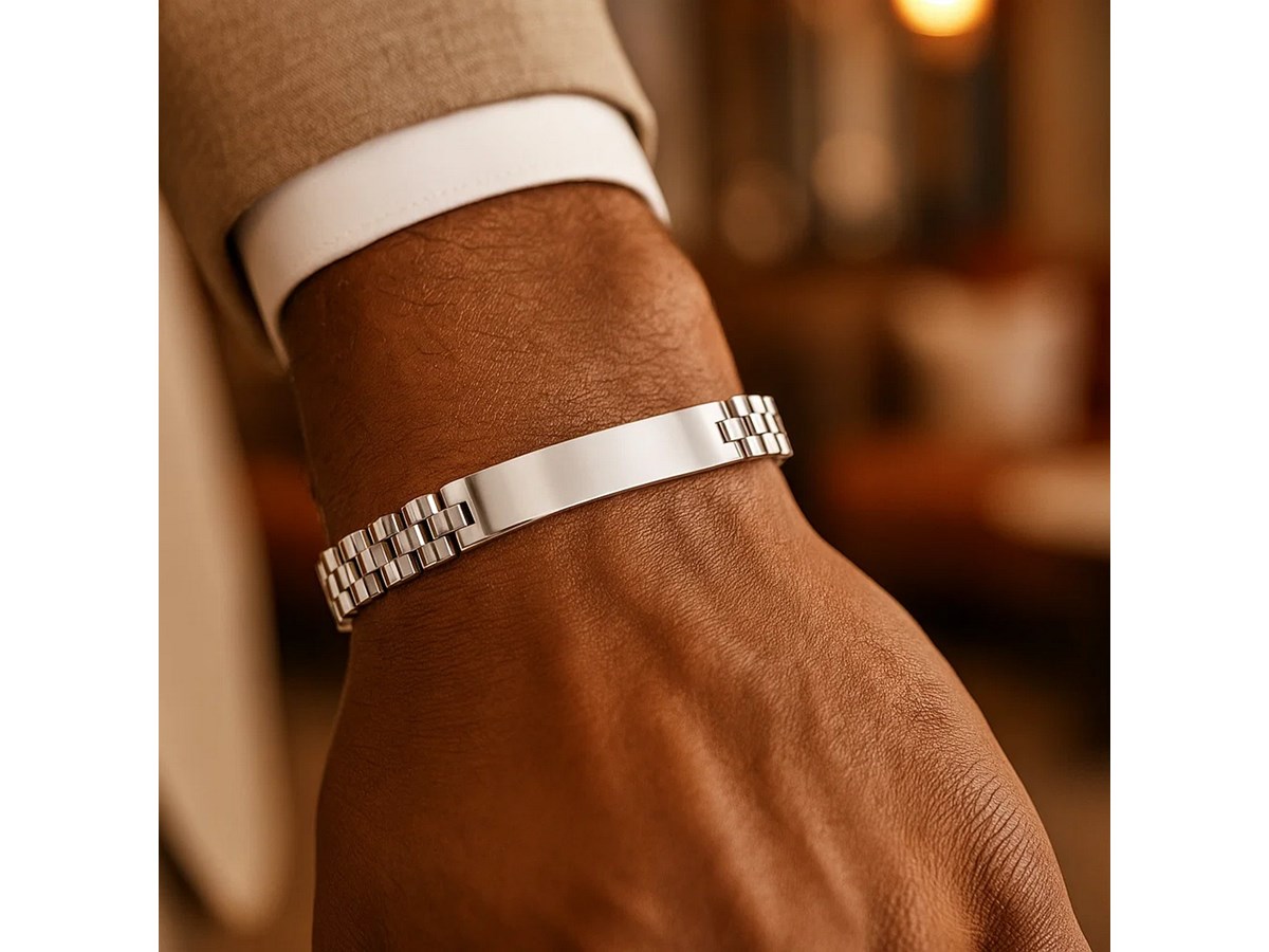 Sleek and modern, this Sterling Silver Rhodium Plated Railroad Chain ID Bracelet offers a bold yet refined look. The railroad chain design adds unique texture and dimension, while the rhodium plating provides lasting shine and tarnish resistance. Finished with a smooth ID plate, it’s perfect for everyday wear and makes a stylish, contemporary addition to any jewelry collection.