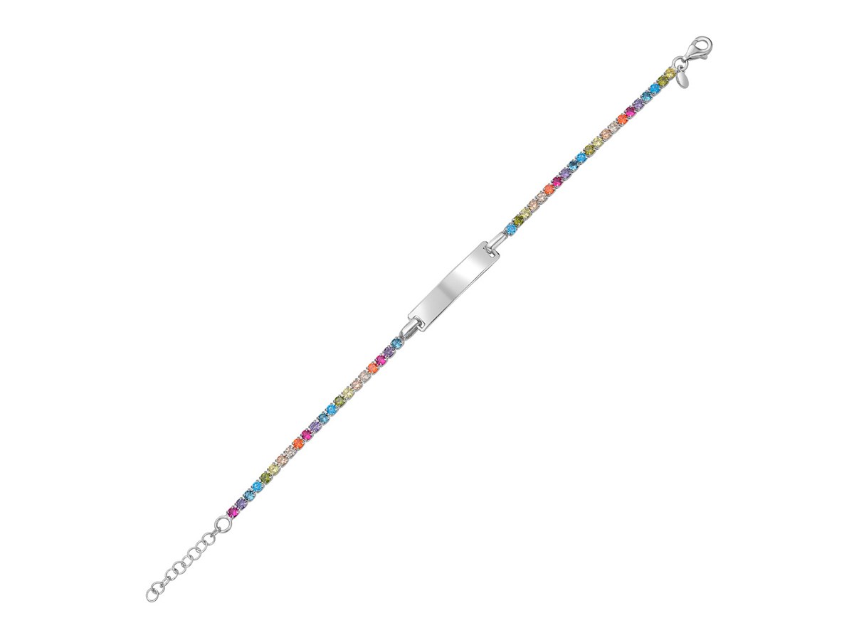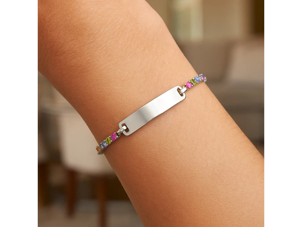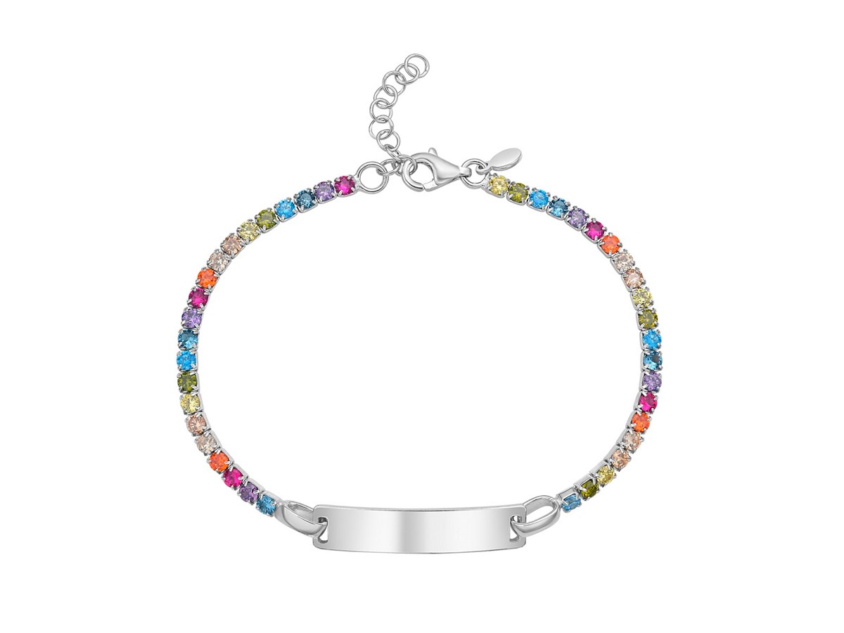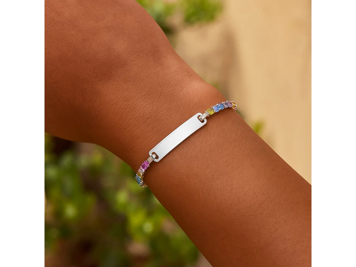 This stylish bracelet features a polished rhodium-plated sterling silver ID bar set with sparkling rainbow CZ stones. Its sleek, colorful design adds a vibrant touch to any look, perfect for layering or wearing solo.