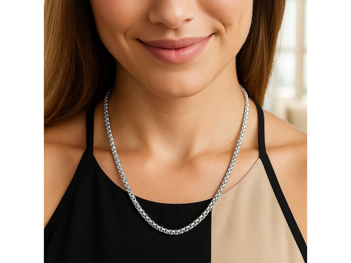 Rhodium plated round box chain crafted in sterling silver measuring 4.4 millimeters in width. Available in lengths 18 inches, 22 inches, 24 inches and 26 inches.