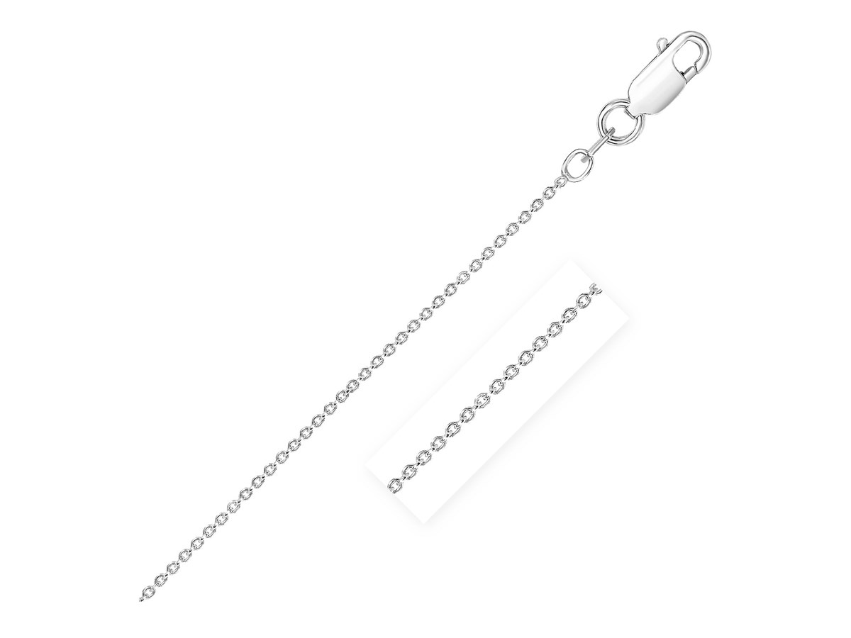 Rhodium plated round cable chain crafted in sterling silver measuring 1.10 millimeters in width. Available in lengths 16 inches,  18 inches and 20 inches .