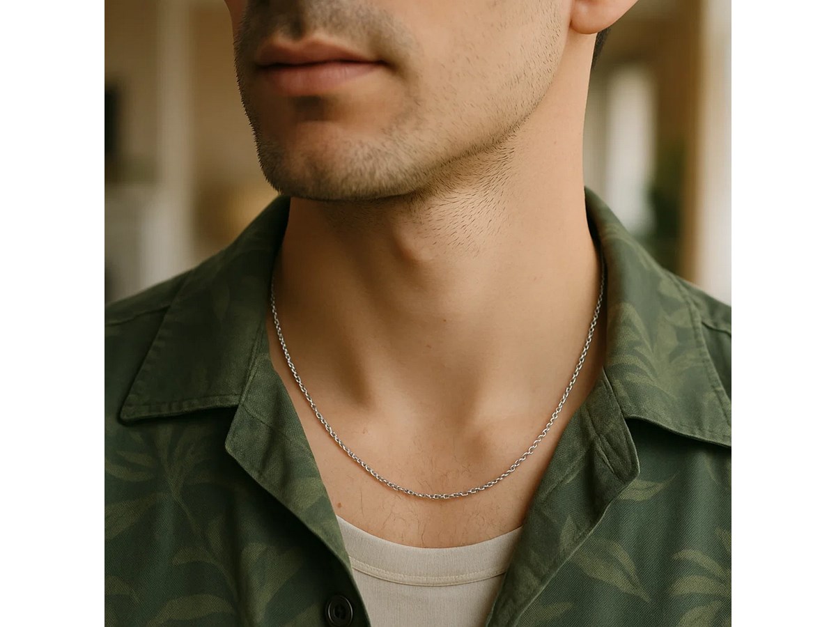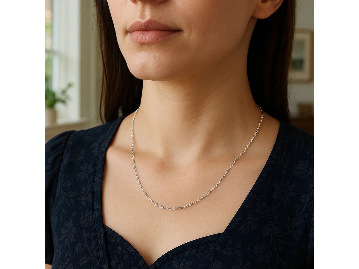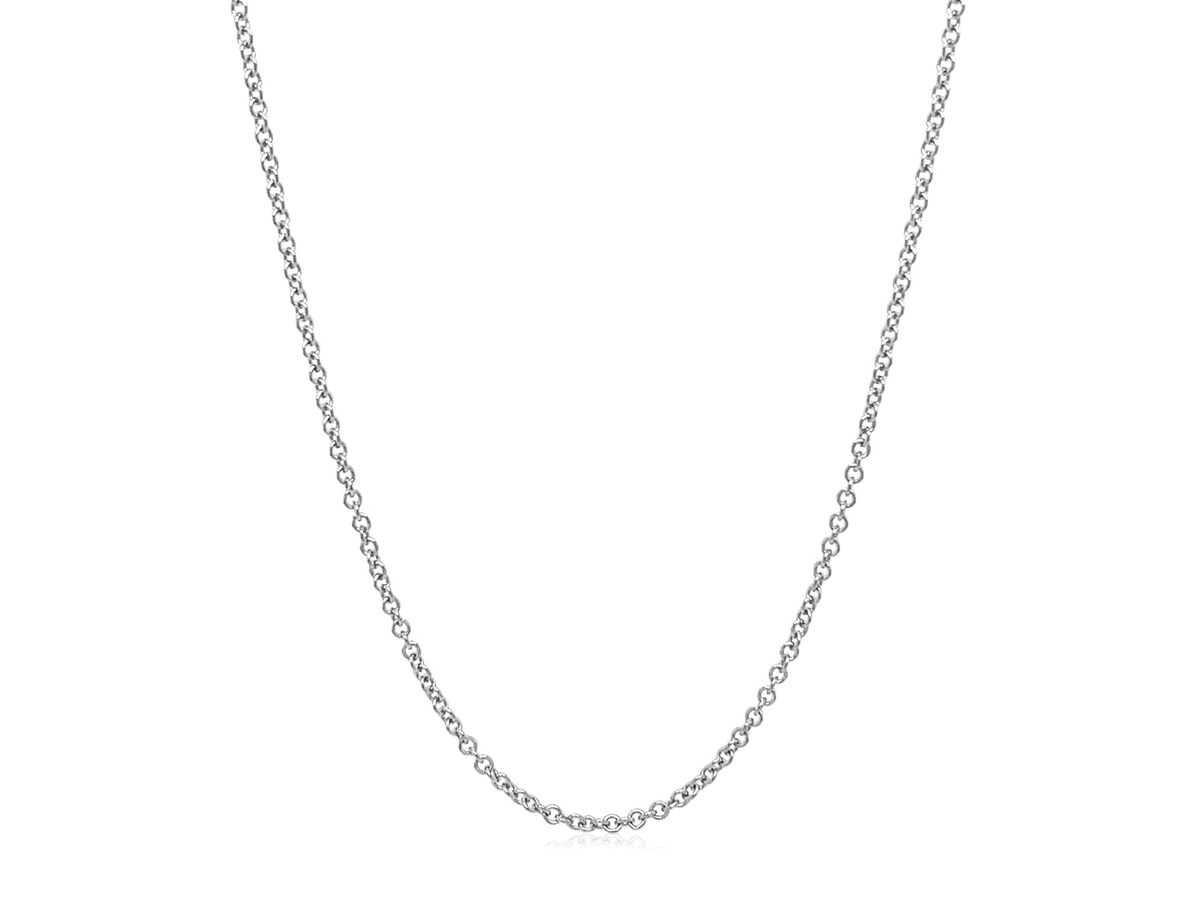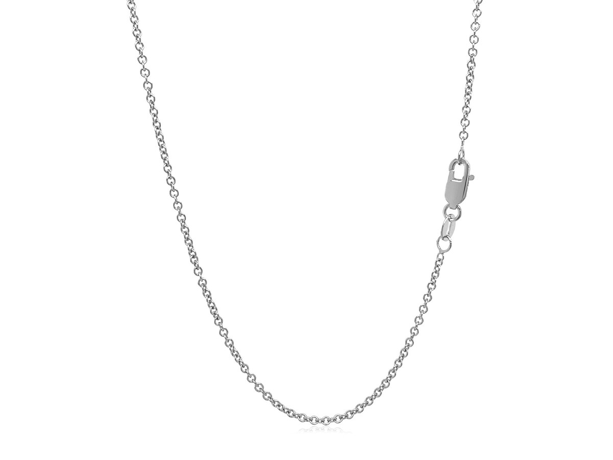 Crafted in sterling silver with a bright rhodium finish, this 1.10 mm round cable chain features smooth, polished links that offer both durability and a clean, modern shine, making it a versatile piece perfect for everyday wear or pairing with your favorite pendant.