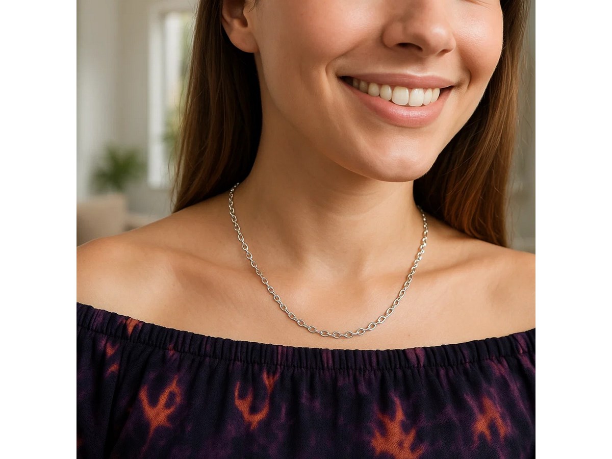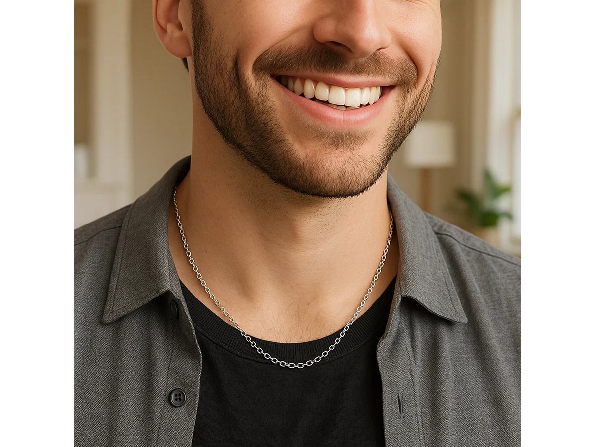 Rhodium plated round cable chain crafted in sterling silver measuring 2.1 millimeters in width. Available in lengths 18 inches, 20 inches  and 24 inches.