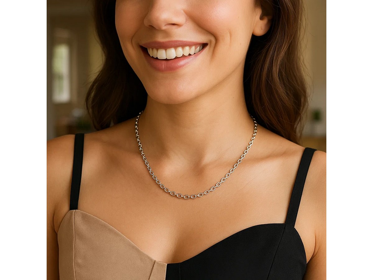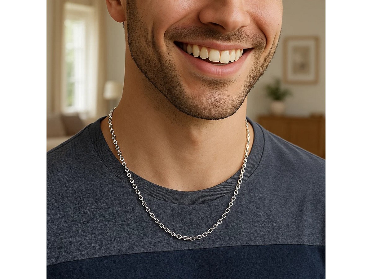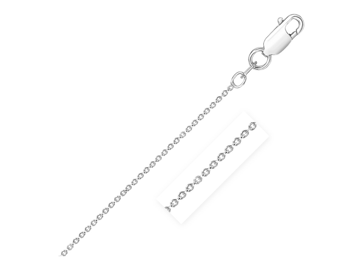 Rhodium plated round cable chain crafted in sterling silver measuring 2.6 millimeters in width. Available in lengths 18 inches, 20 inches and 24 inches.