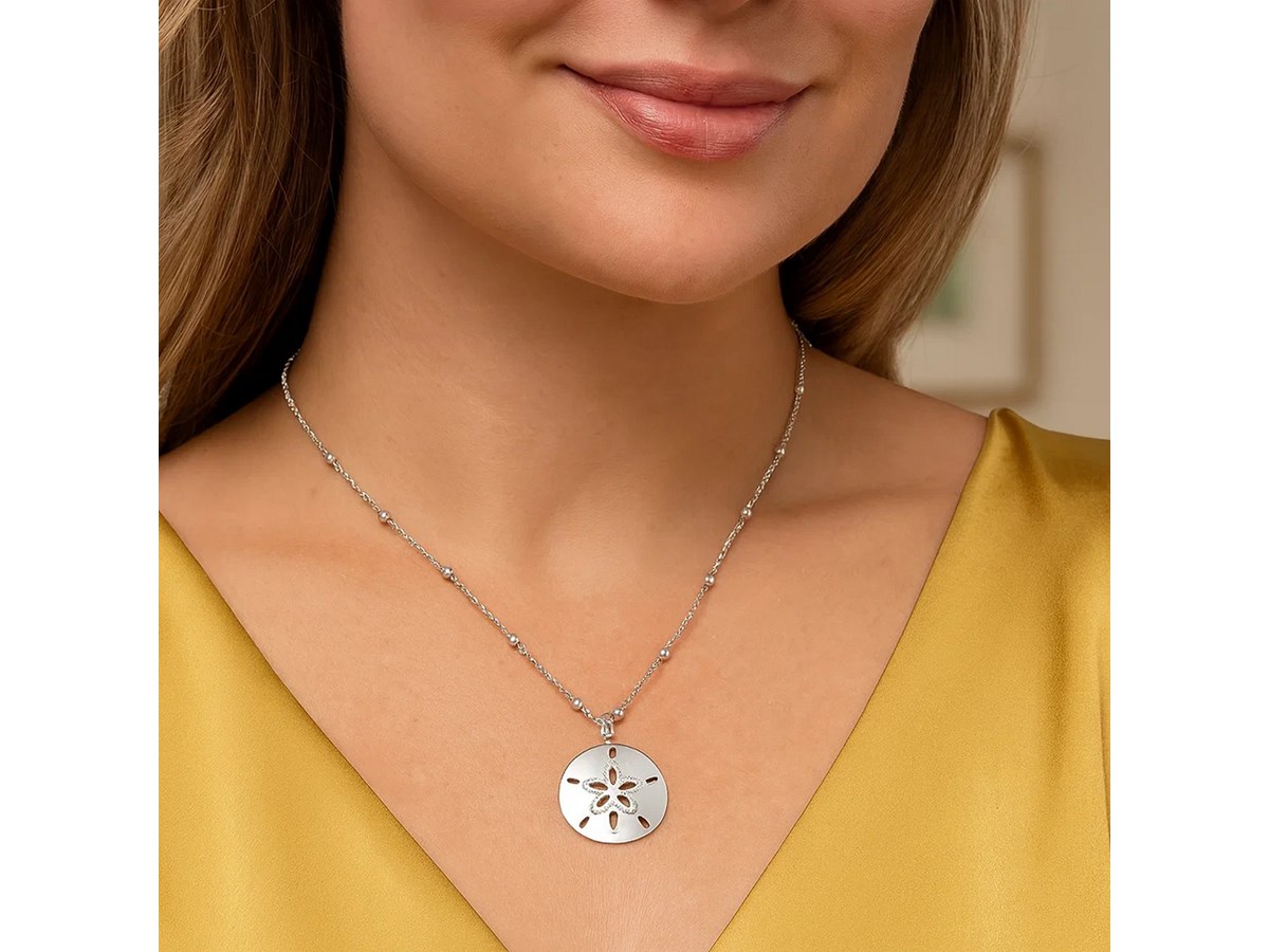 This necklace features a finely detailed sand dollar pendant crafted in sterling silver with a radiant rhodium-plated finish. Simple and elegant, it brings a touch of coastal charm to any style.