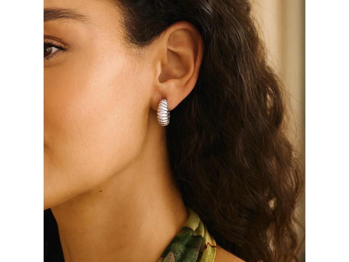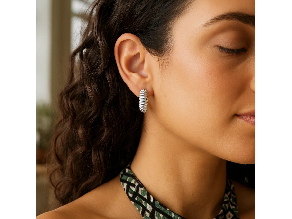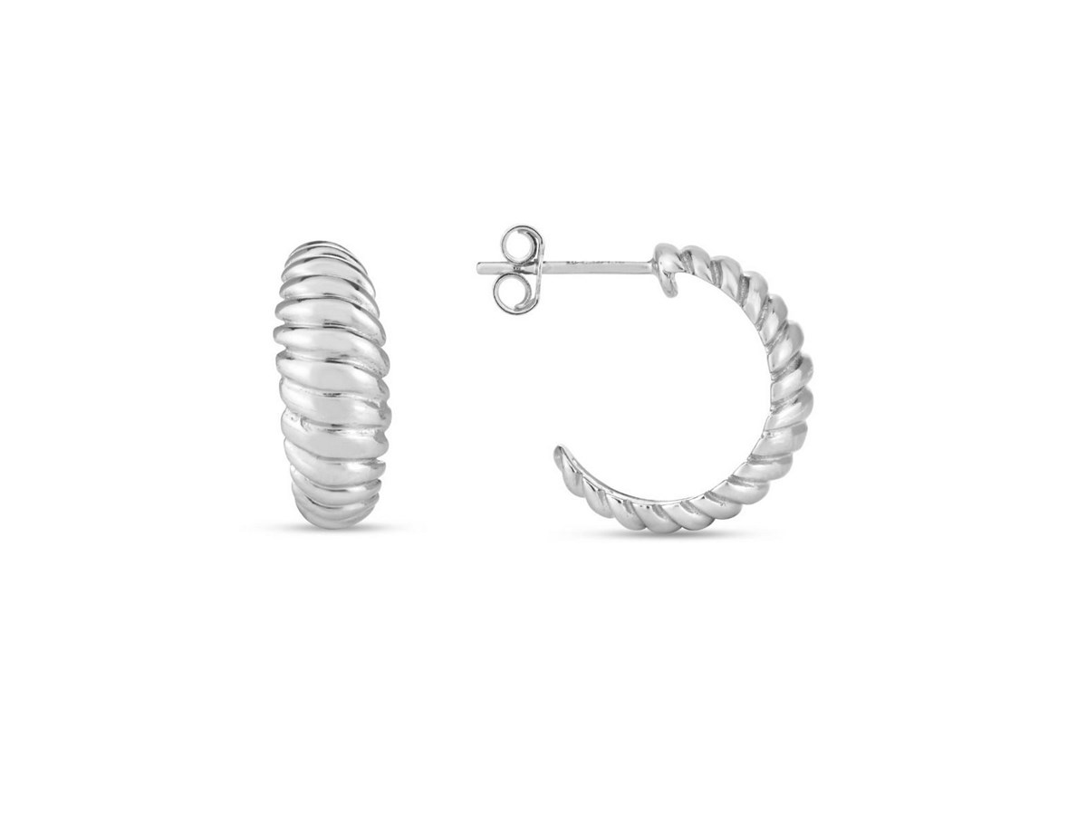 Chic sterling silver rhodium plated small ribbed twisted hoop earrings featuring a sleek, textured design with a radiant polished finish. The ribbed twist adds depth and sparkle, while the rhodium plating ensures lasting shine and elegance for everyday wear.