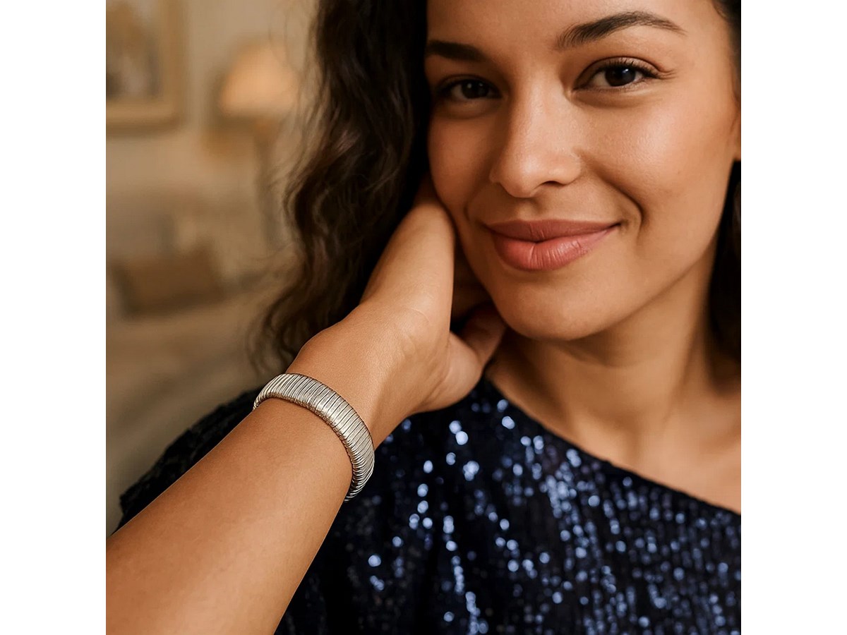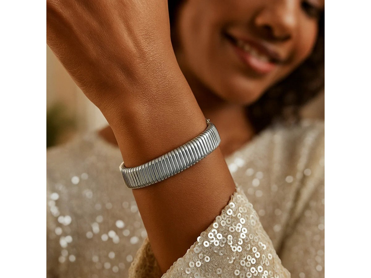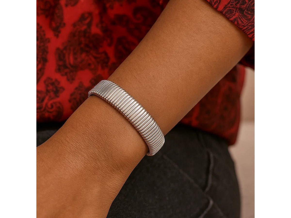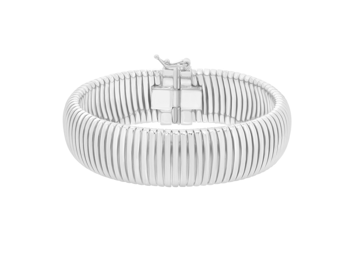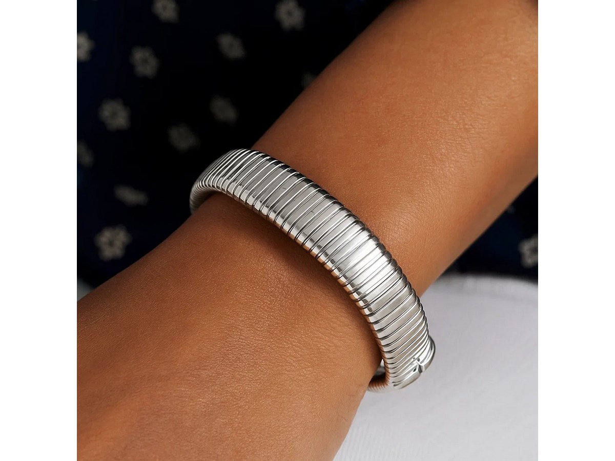 This sterling silver rhodium plated Tubogas bracelet (16.00 mm) features a wide, flexible coil design with a smooth, high-polish finish. Its bold thickness and modern shine create a standout statement piece perfect for elevating any look.