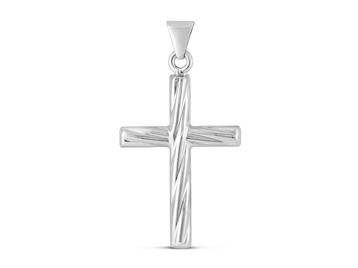 Modern and graceful, this sterling silver twisted cross pendant is enhanced with brilliant rhodium plating for a radiant, lasting shine. Its flowing, sculpted design offers a contemporary interpretation of a timeless symbol, perfect for everyday wear or meaningful gifting. Stylish, refined, and beautifully expressive.