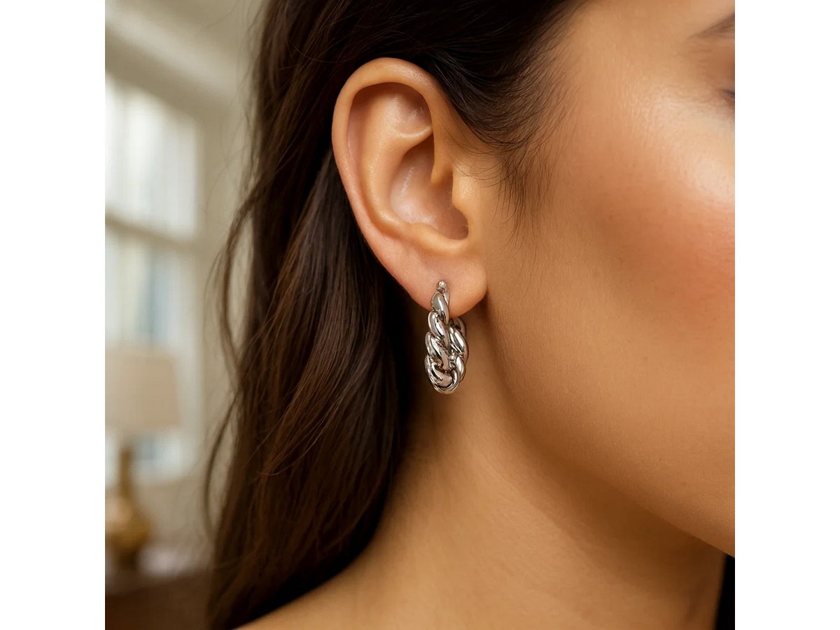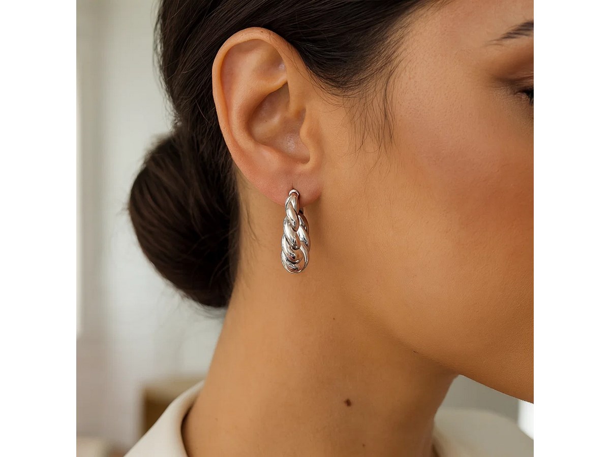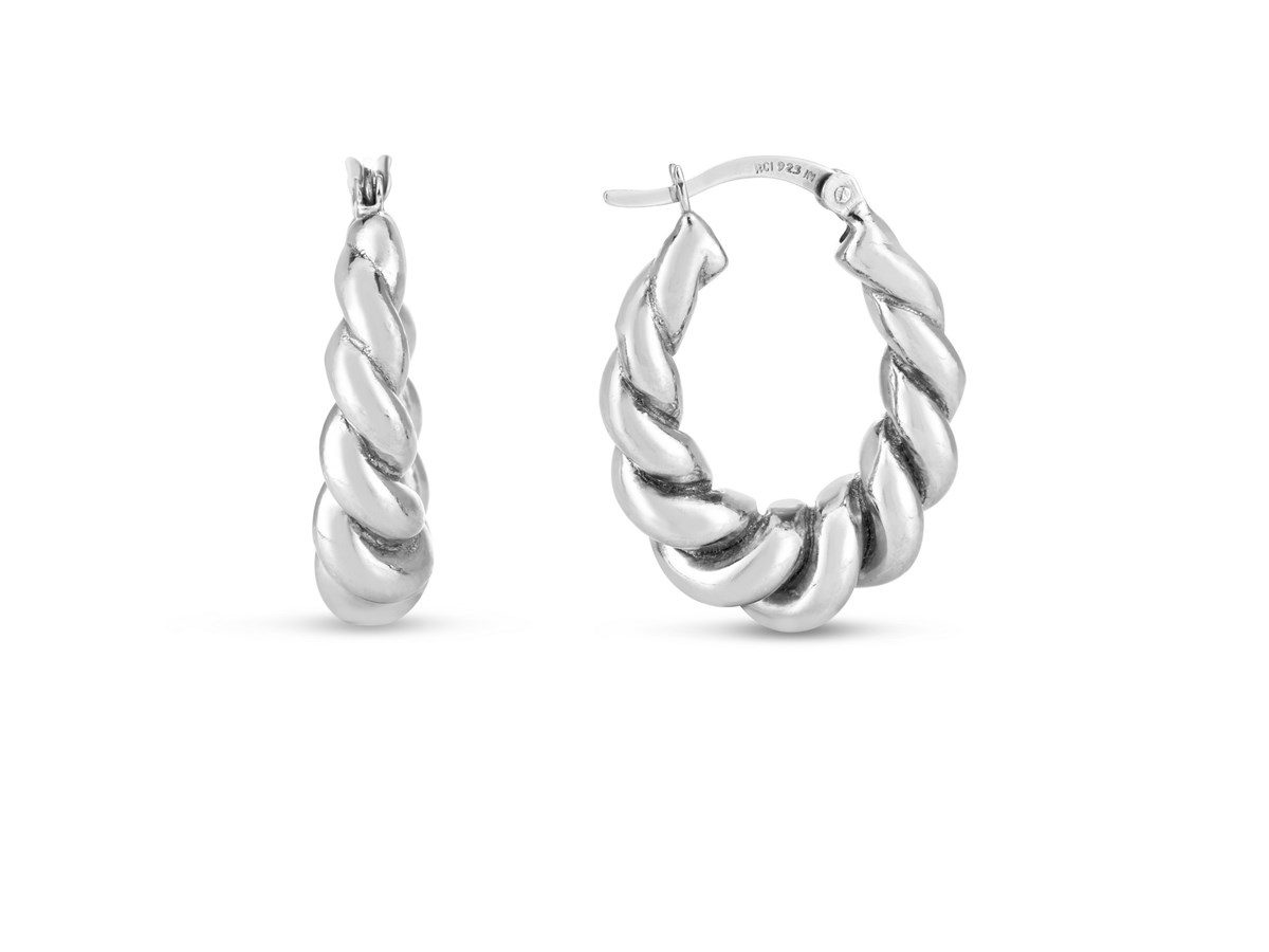 Elegant sterling silver rhodium plated twisted hoop earrings featuring a sleek, intertwined design with a brilliant polished finish. The rhodium plating enhances shine and durability, offering a timeless, sophisticated look perfect for any occasion.
