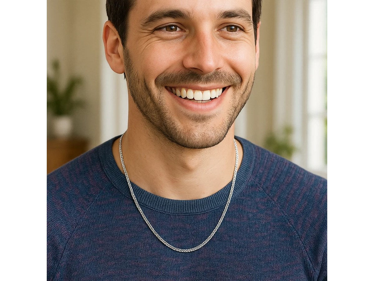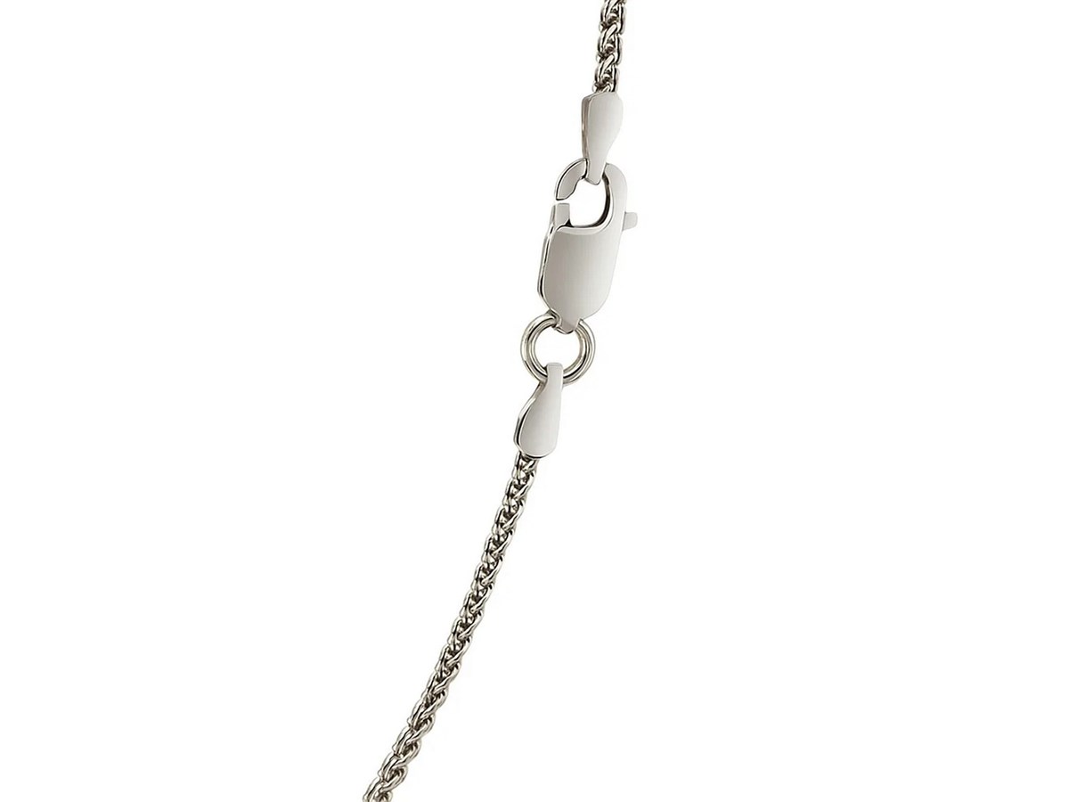 Rhodium plated wheat chain crafted in sterling silver measuring 1.3 millimeters in width. Available in lengths 16 inches, 18 inches, 20 inches and 24 inches.