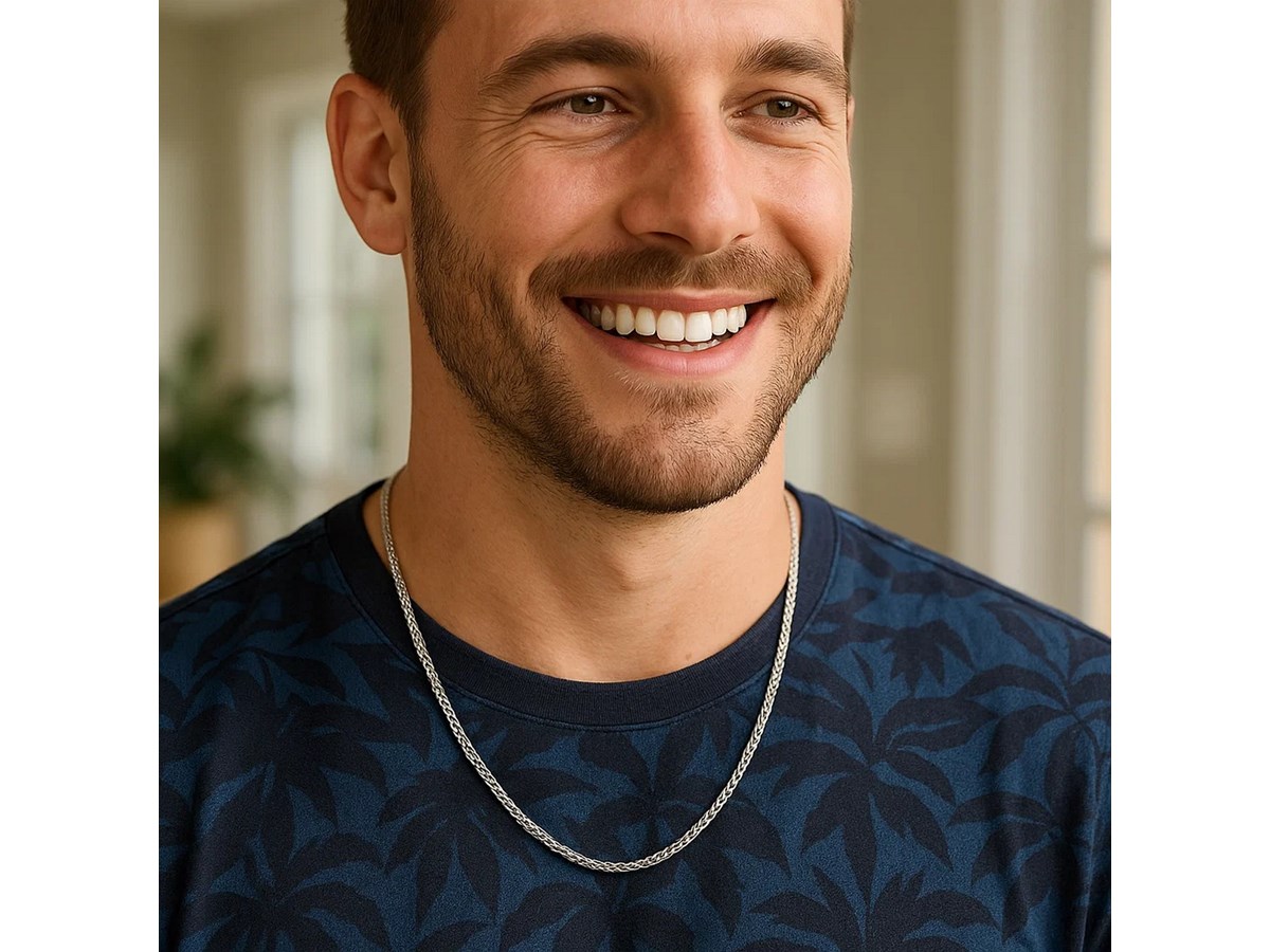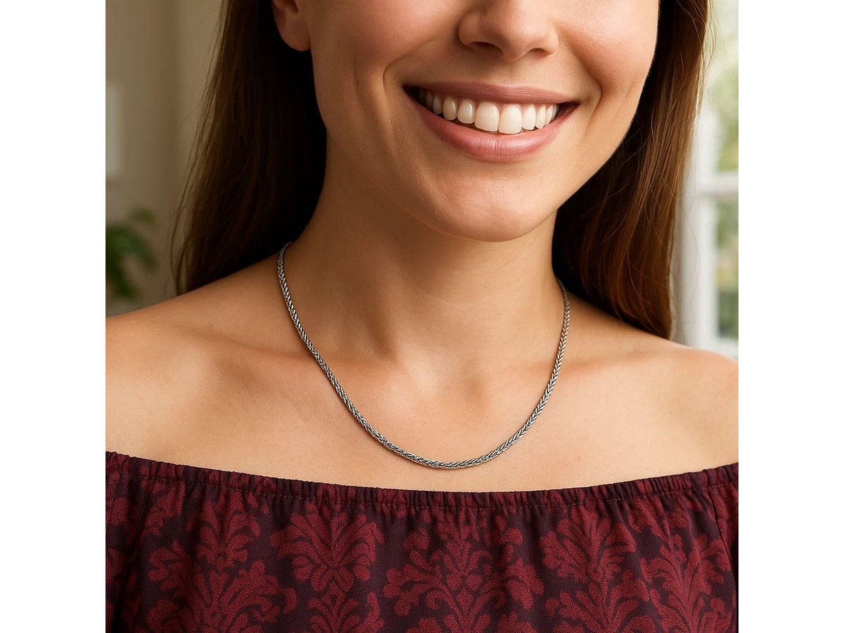 Rhodium plated wheat chain crafted in sterling silver measuring 1.9 millimeters in width. Available in lengths 16 inches, 18 inches, 20 inches and 24 inches.