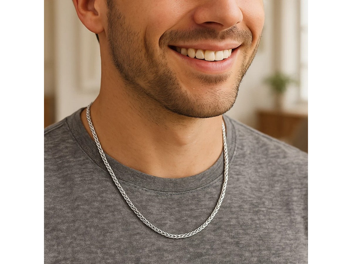 Rhodium plated wheat chain crafted in sterling silver measuring 3.20 millimeters in width. Available in lengths 18 inches, 20 inches, 22 inches, and 24 inches.