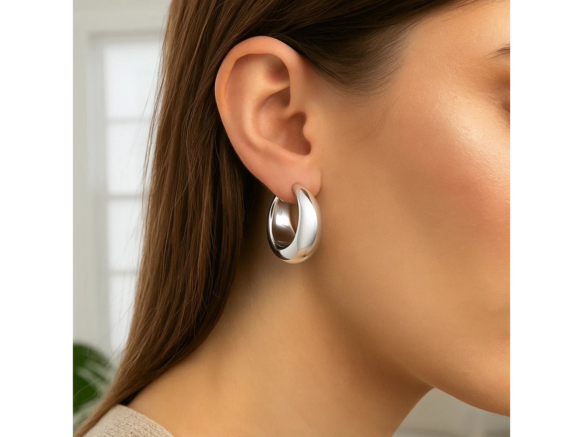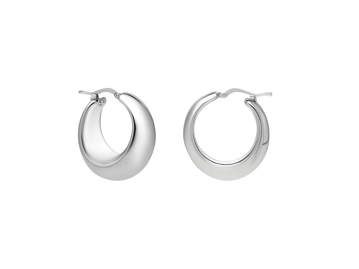 Elegant sterling silver sculpted hoop earrings featuring a polished finish and fluid, contoured design. The sculpted silhouette adds depth and modern sophistication, creating a timeless look perfect for both everyday elegance and special occasions.