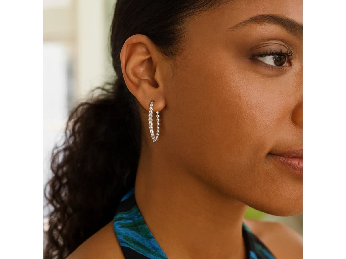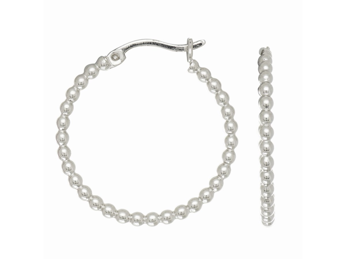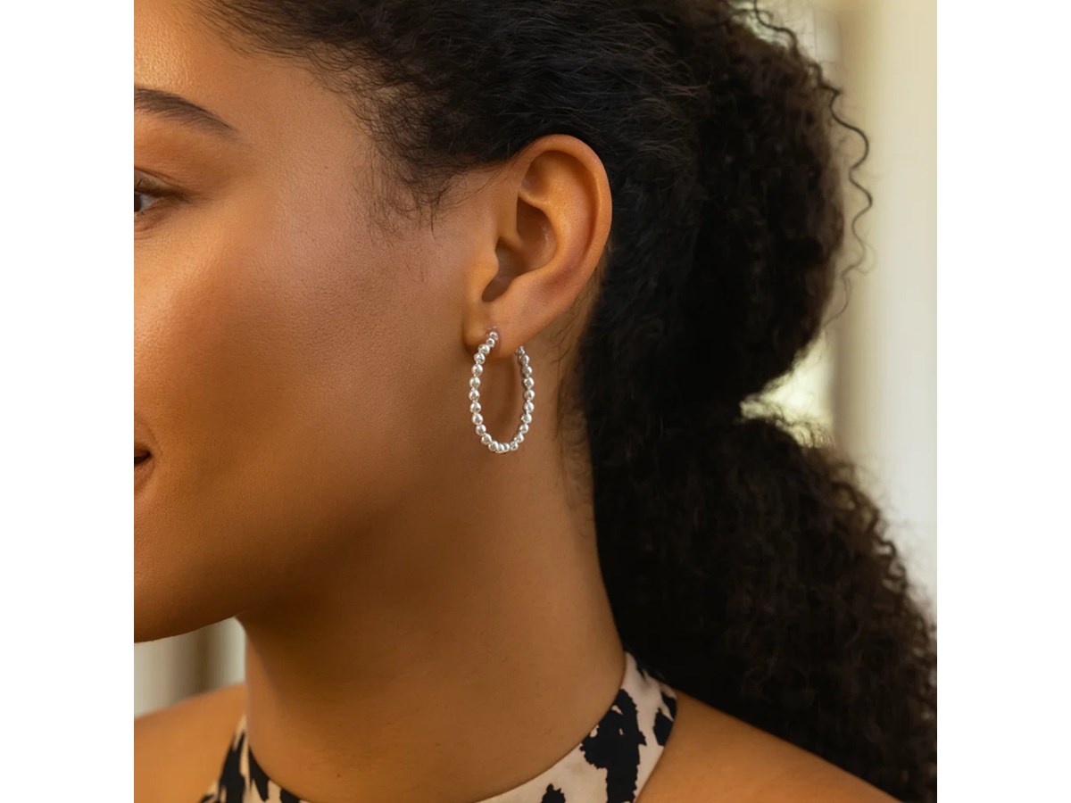 Delicate sterling silver small bead hoop earrings featuring a sleek row of polished beads for a subtle yet stylish look. Their minimalist design and radiant shine make them perfect for everyday wear or effortless layering with other pieces.
