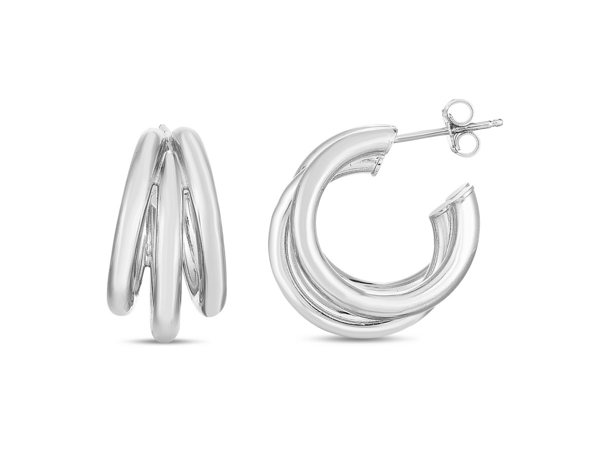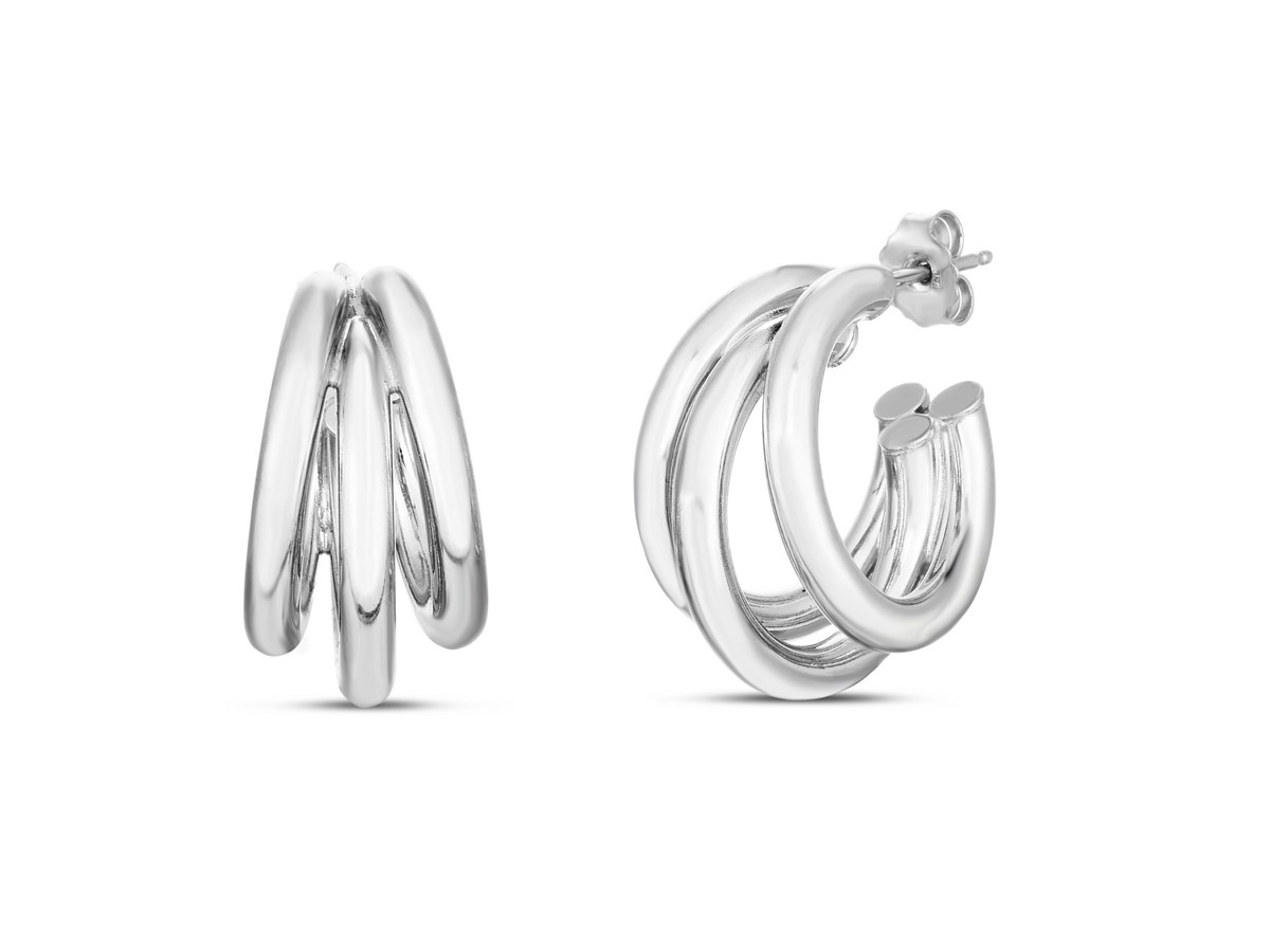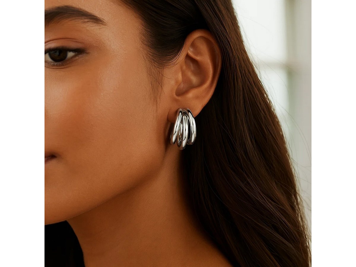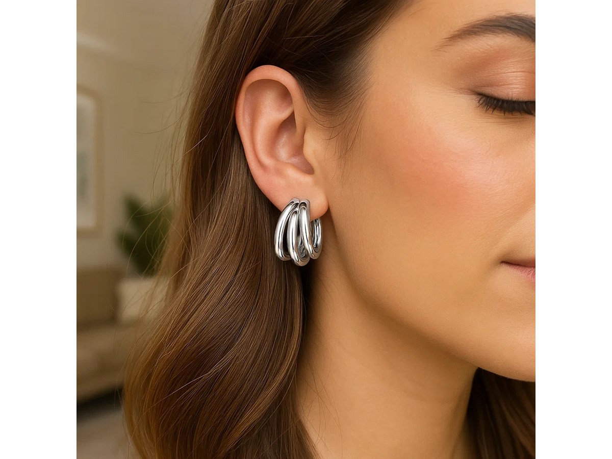 Elegant sterling silver triple barrelled strand hoop earrings featuring a polished finish and modern layered design. The three rounded strands create depth and dimension, offering a bold yet refined look perfect for everyday sophistication or special occasions.