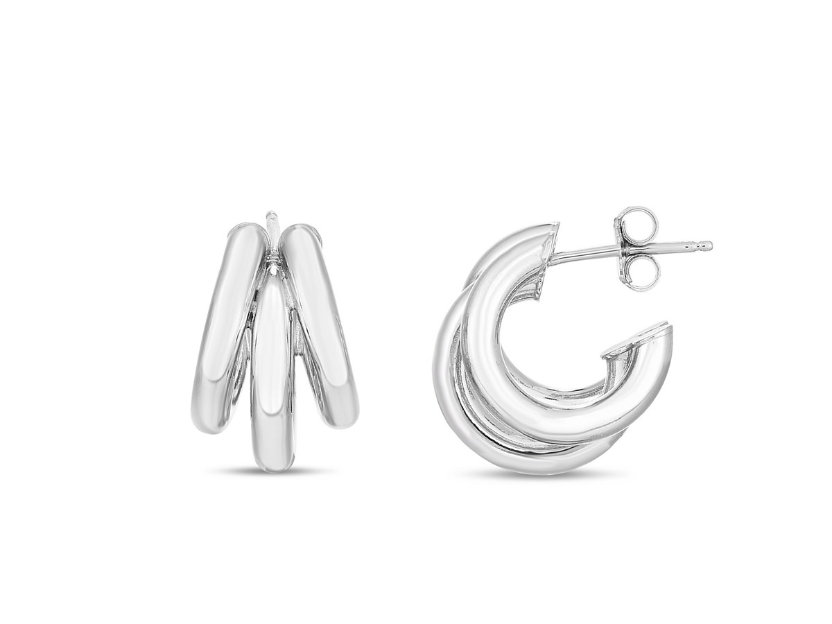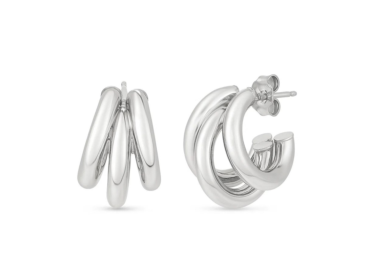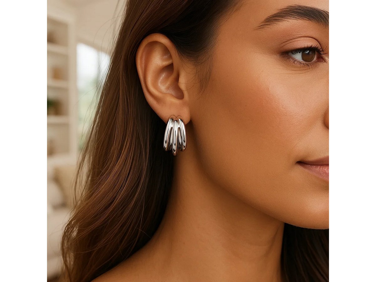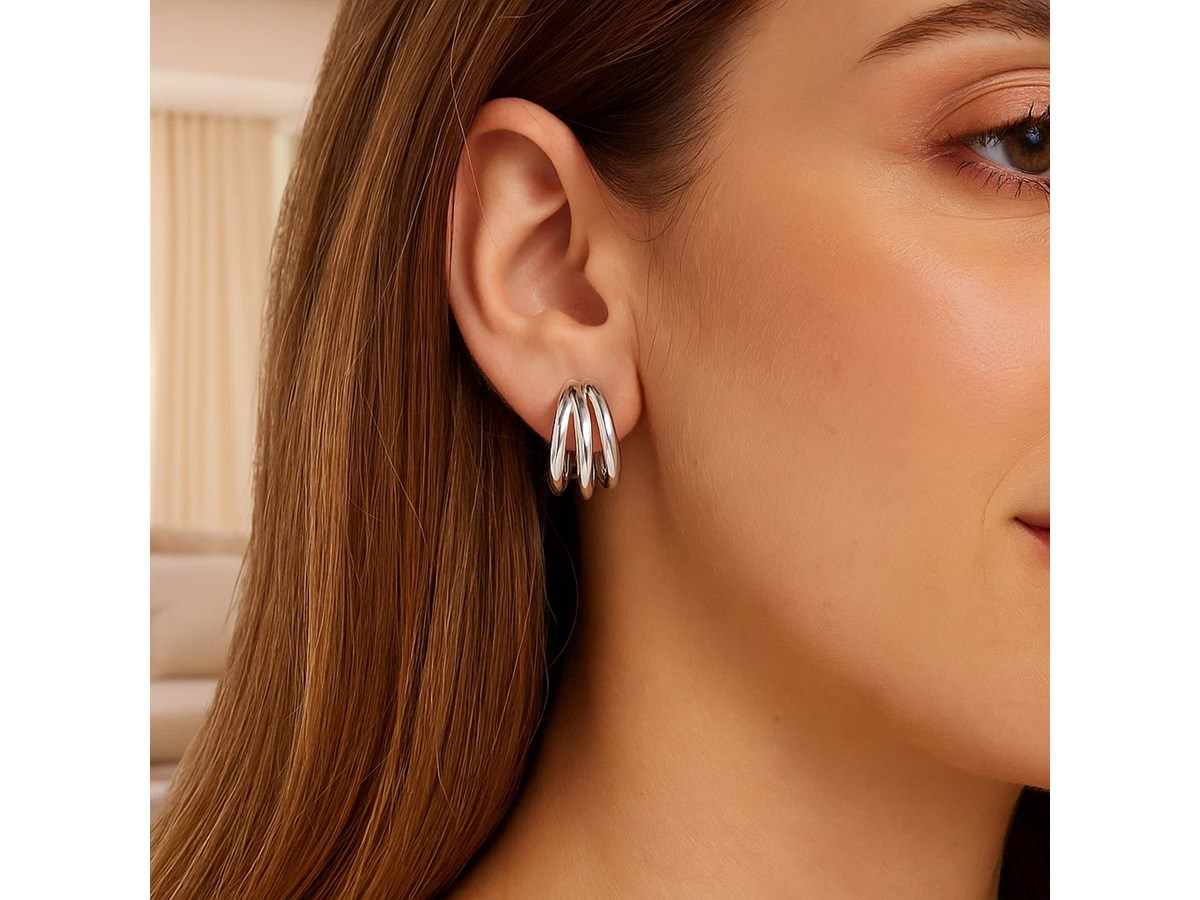 Elegant sterling silver triple barrelled strand hoop earrings featuring a polished finish and modern layered design. The three rounded strands create depth and dimension, offering a bold yet refined look perfect for everyday sophistication or special occasions.