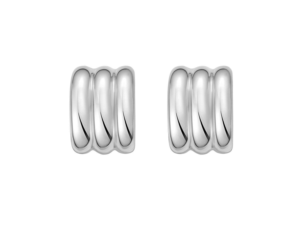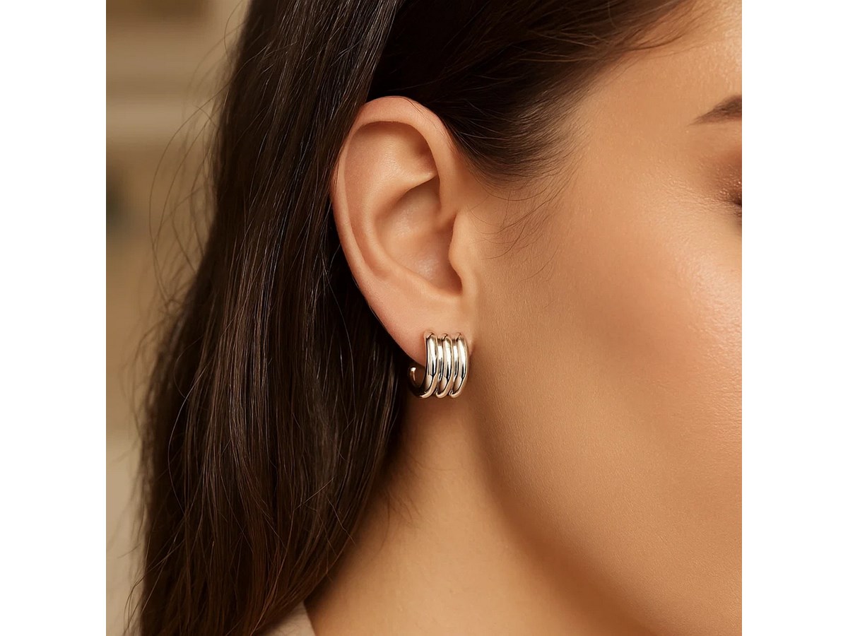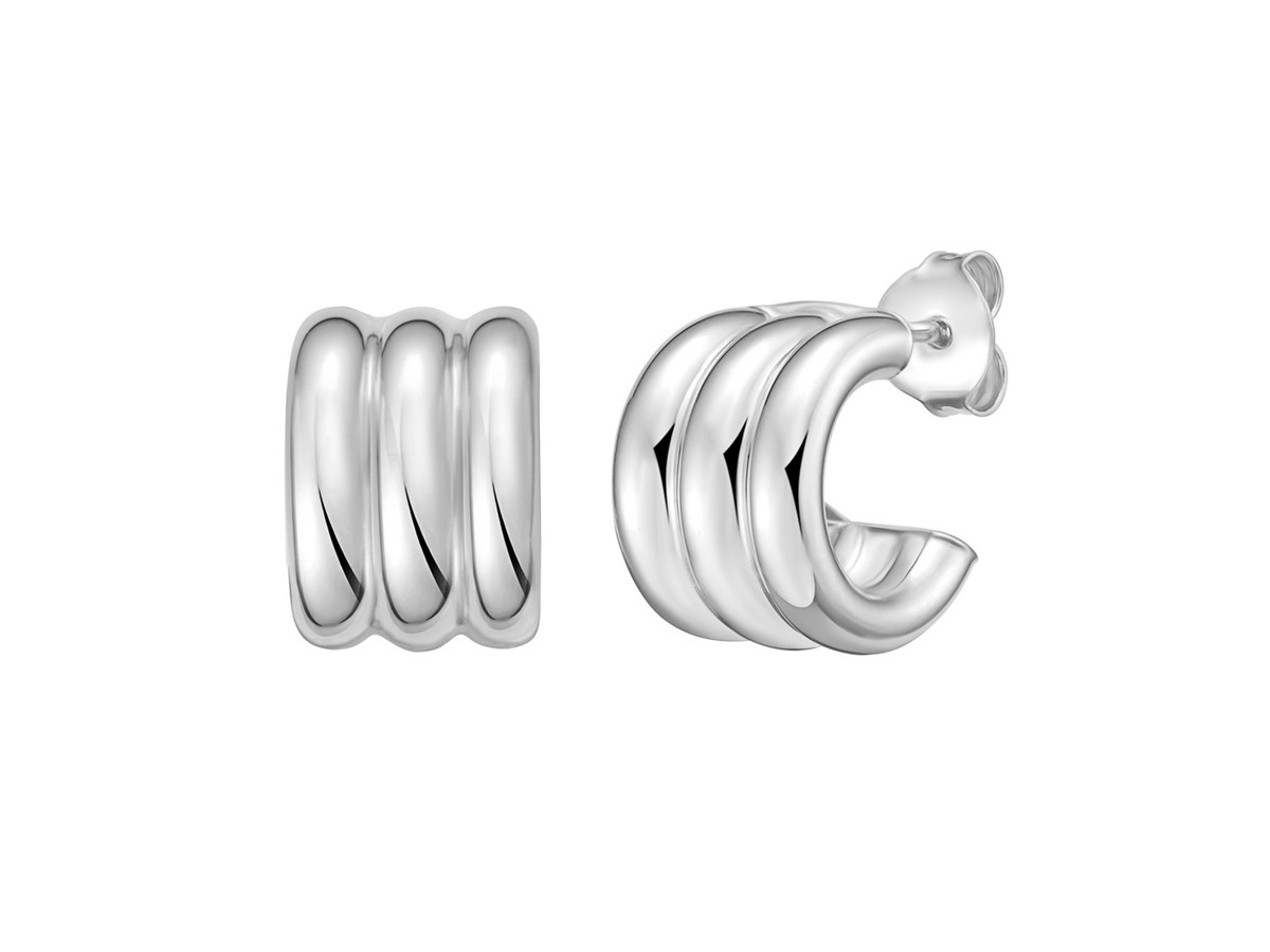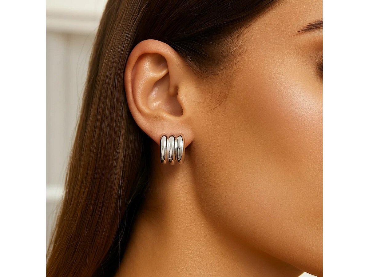 Stylish sterling silver triple row C hoop earrings featuring a polished finish and contemporary open-hoop design. The triple row detail adds depth and dimension, creating a bold yet refined look perfect for everyday elegance or evening sophistication.