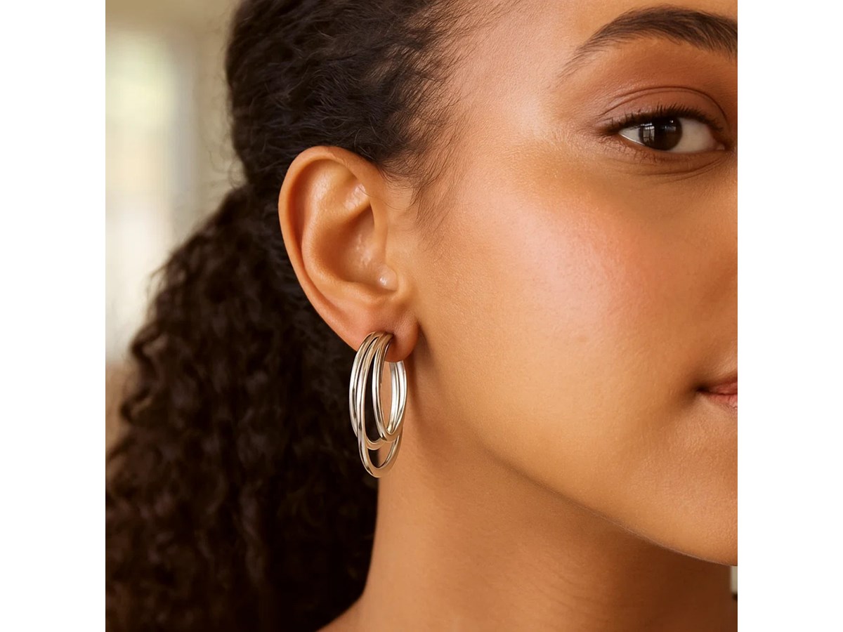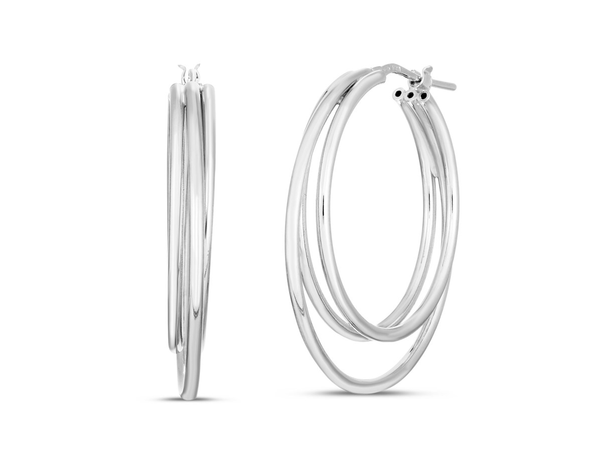Elegant sterling silver triple row hoop earrings featuring a polished finish and sleek layered design. The triple row detail adds depth and shine, creating a refined and timeless look perfect for everyday wear or special occasions.