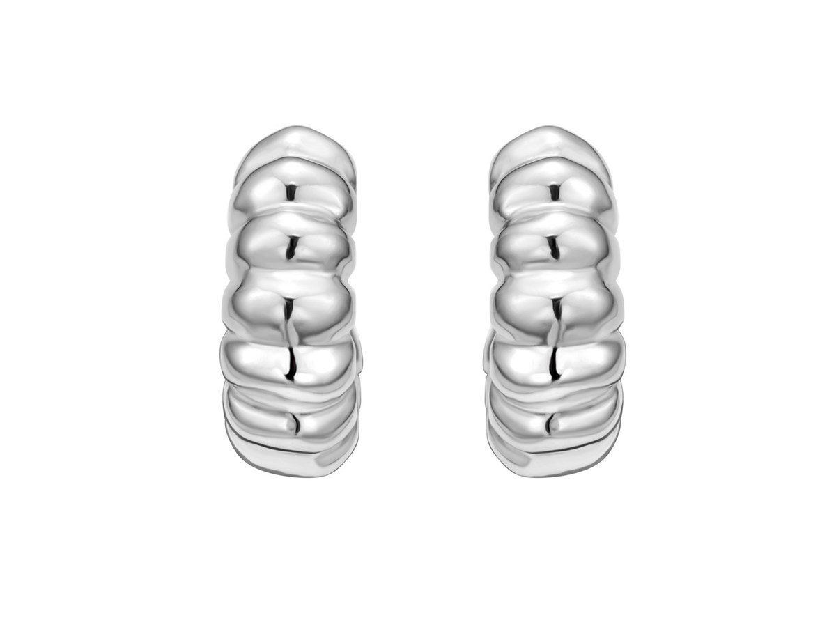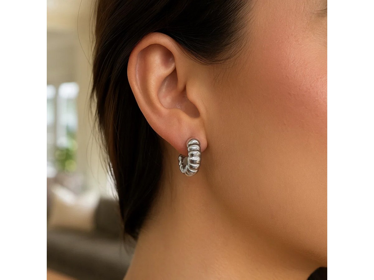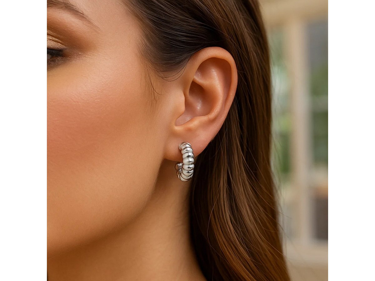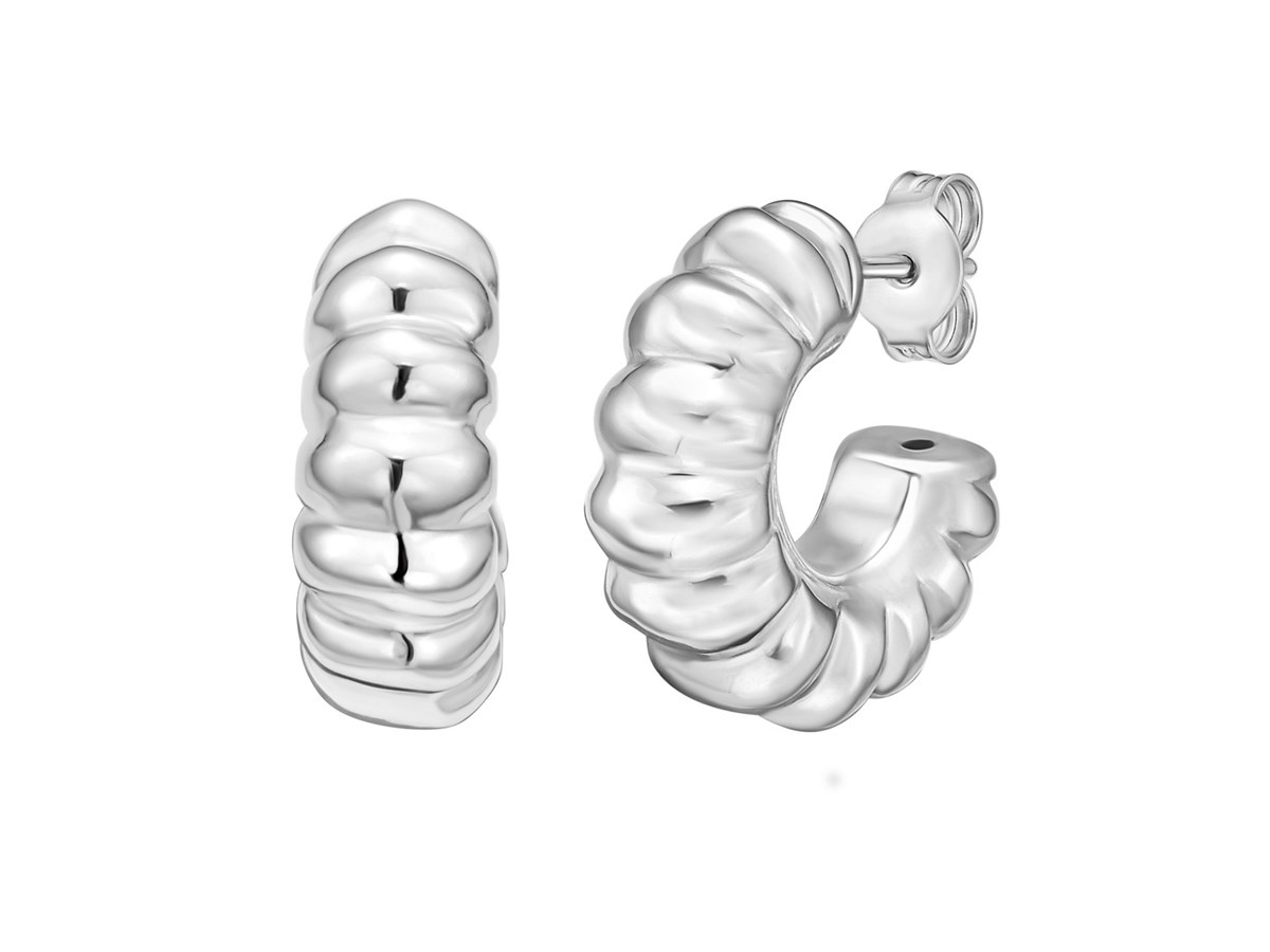 Elegant sterling silver twisted C hoop earrings featuring a polished finish and modern open-hoop design. The subtle twist detail adds texture and movement, creating a timeless look that effortlessly transitions from day to night.