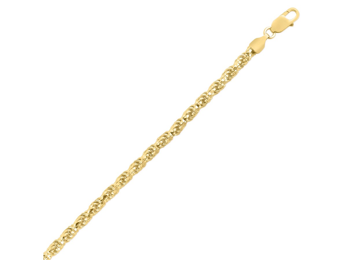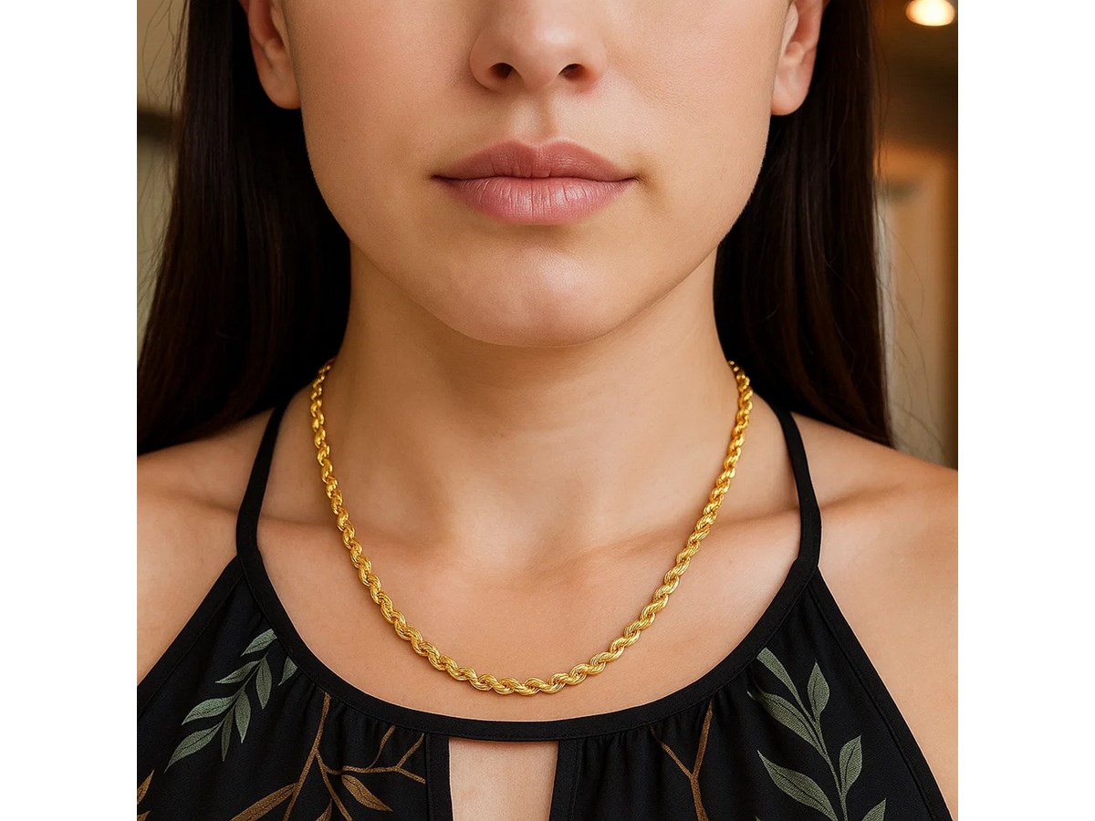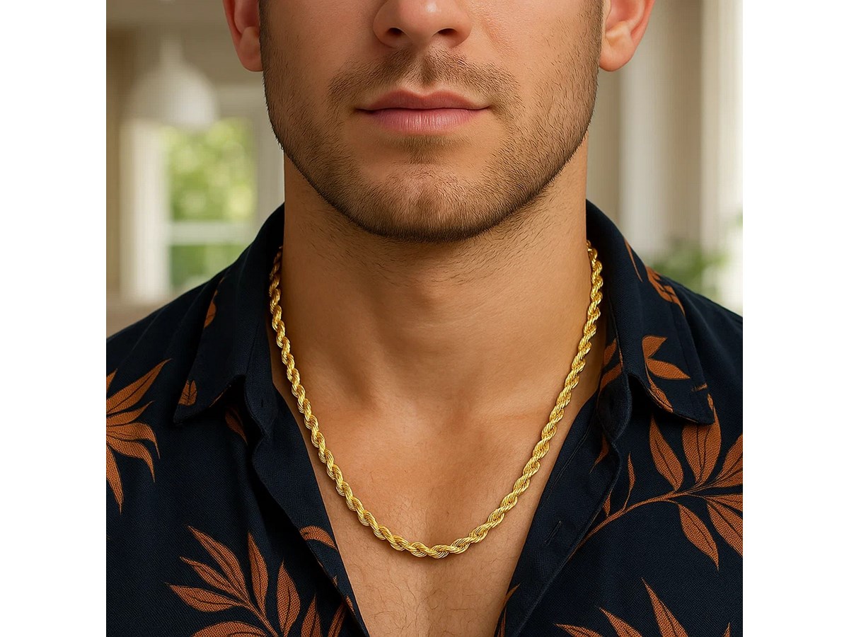 Crafted in sterling silver with a warm yellow gold plating, this 5.00 mm diamond-cut royal rope chain features intricately twisted links enhanced with faceted detailing that sparkles from every angle, offering a bold yet refined shine perfect for wearing alone or pairing with your favorite pendant.
