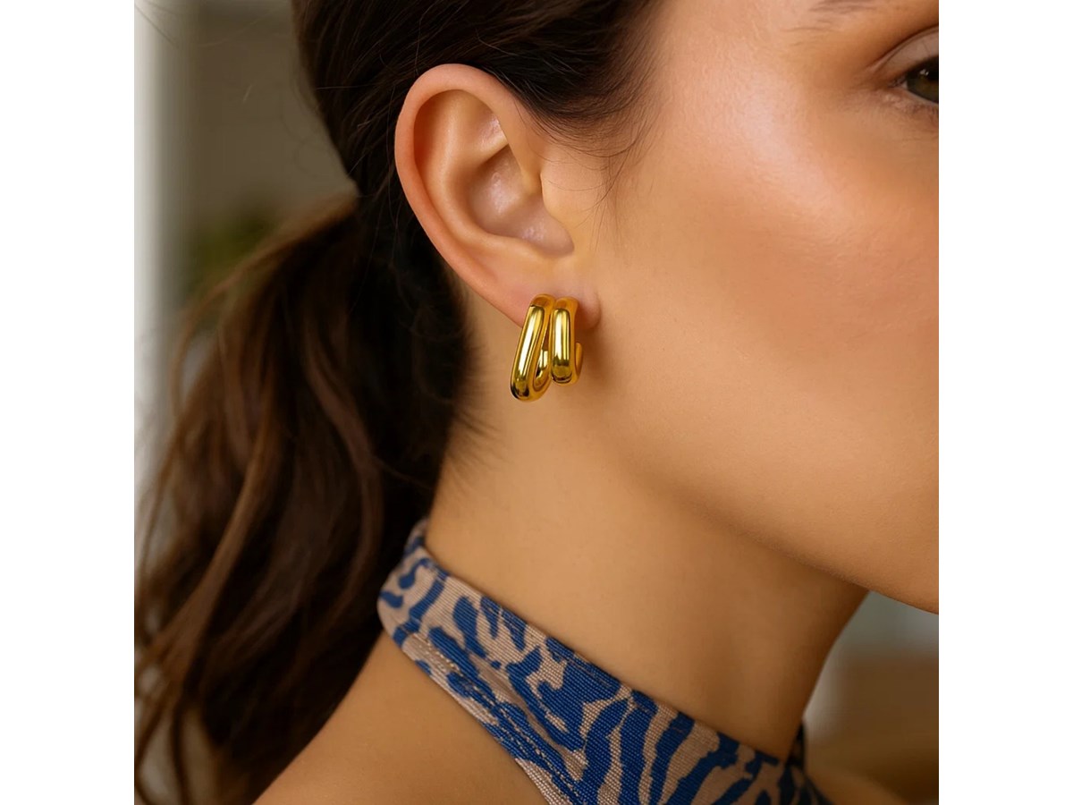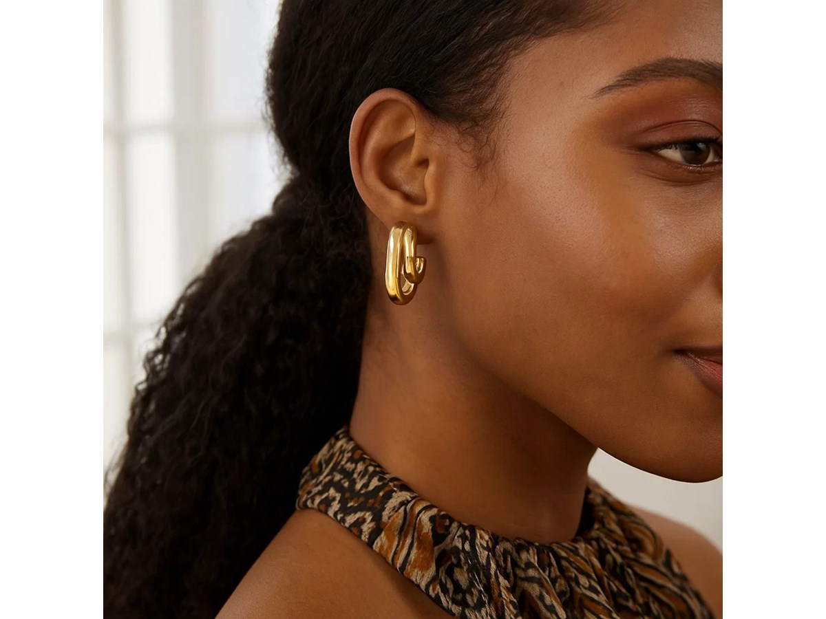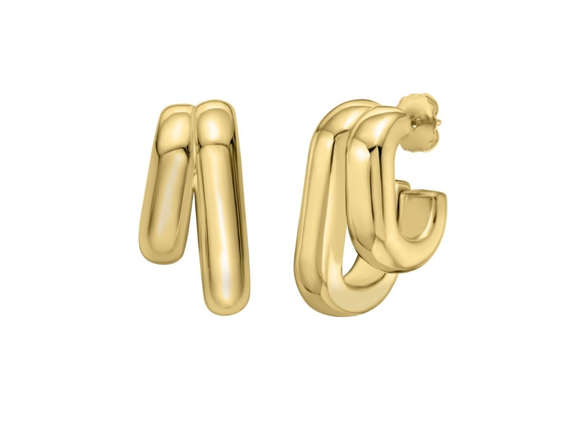 Elegant sterling silver yellow gold plated double row big and small hoop earrings featuring a polished finish and interlocking design. The combination of large and small hoops adds depth and movement, creating a modern, sophisticated look perfect for any occasion.