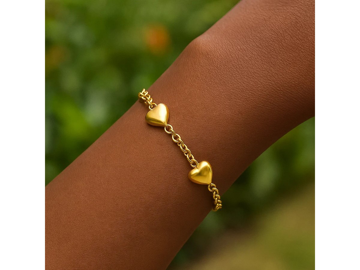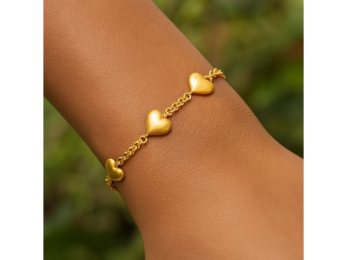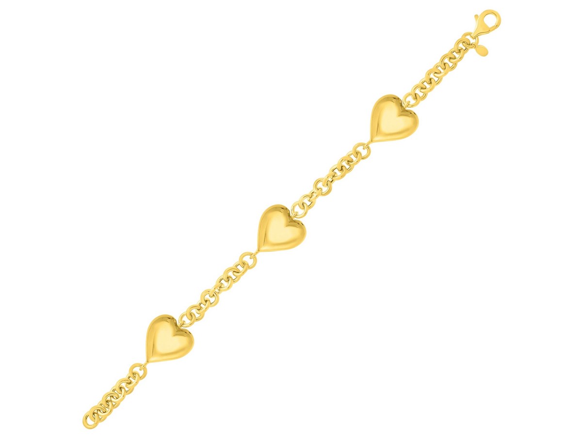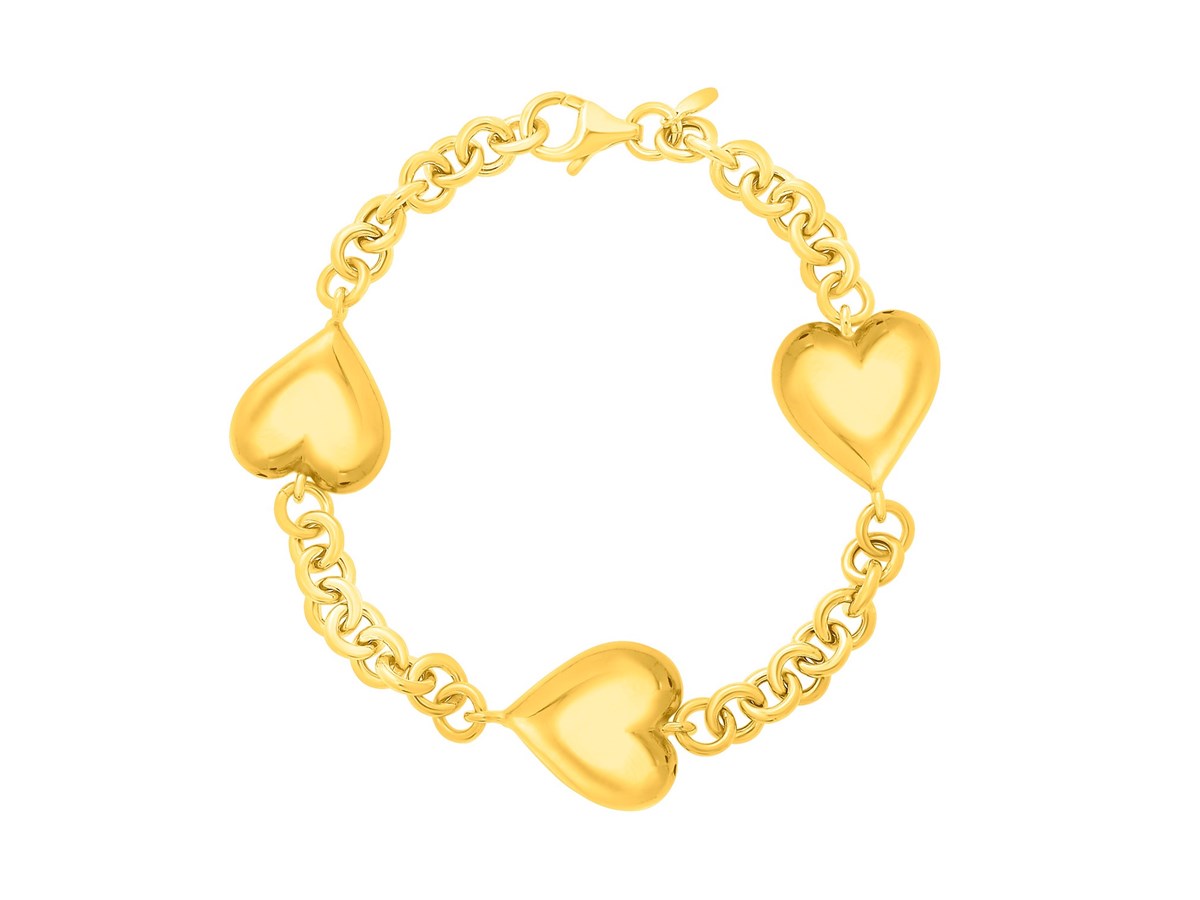 This sterling silver yellow gold plated triple heart bracelet features three extra-puffed polished hearts linked along a delicate chain. Its warm shine and romantic design create a bold yet feminine piece perfect for everyday wear, layering, or gifting.