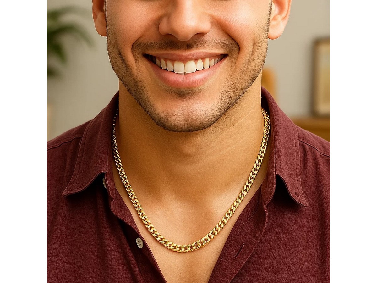 Crafted in sterling silver with a luxurious yellow gold plating, this 4.90 mm Miami Cuban chain features tightly interlocking links that create a bold, smooth drape and a radiant high-shine finish, making it a timeless statement piece perfect for elevating any look on its own or with a standout pendant.