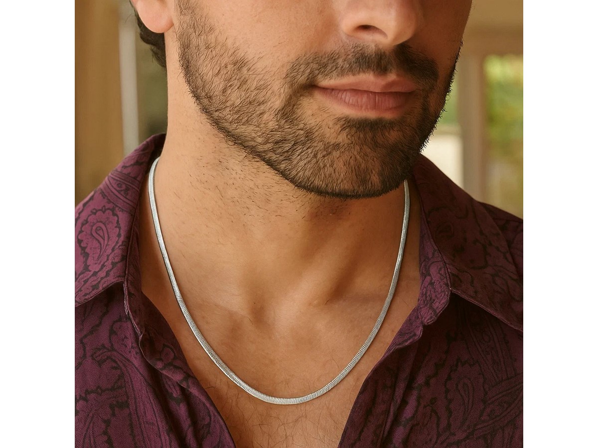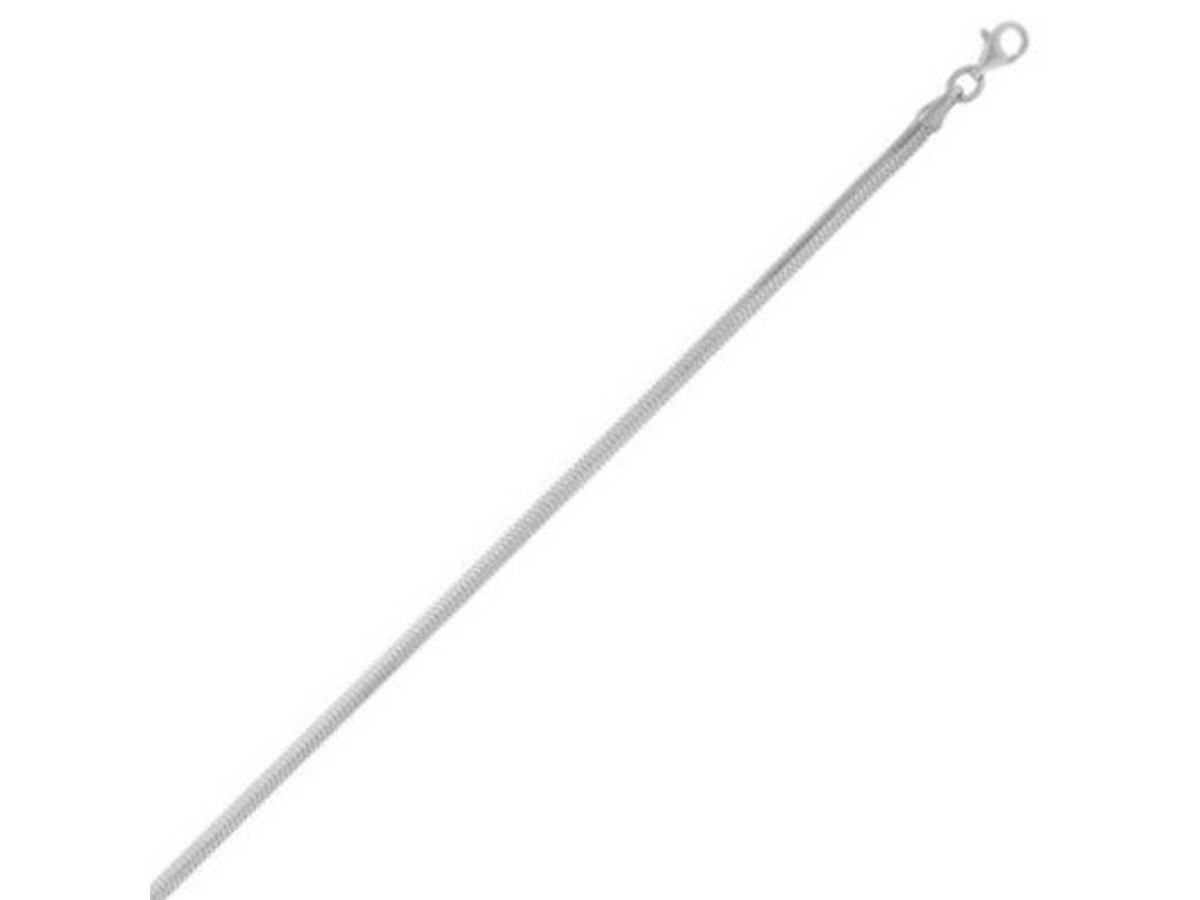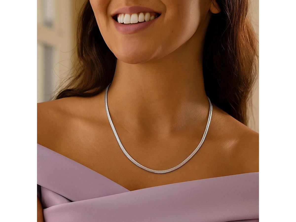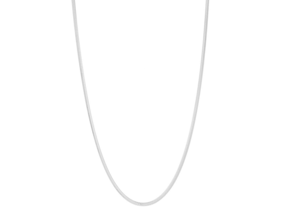 Crafted in sterling silver with a sleek rhodium finish, this 2.60 mm oval snake chain features smooth, elongated links that create a flexible, fluid drape and a bright, polished shine, making it a versatile accessory perfect for everyday wear or pairing with your favorite pendant.