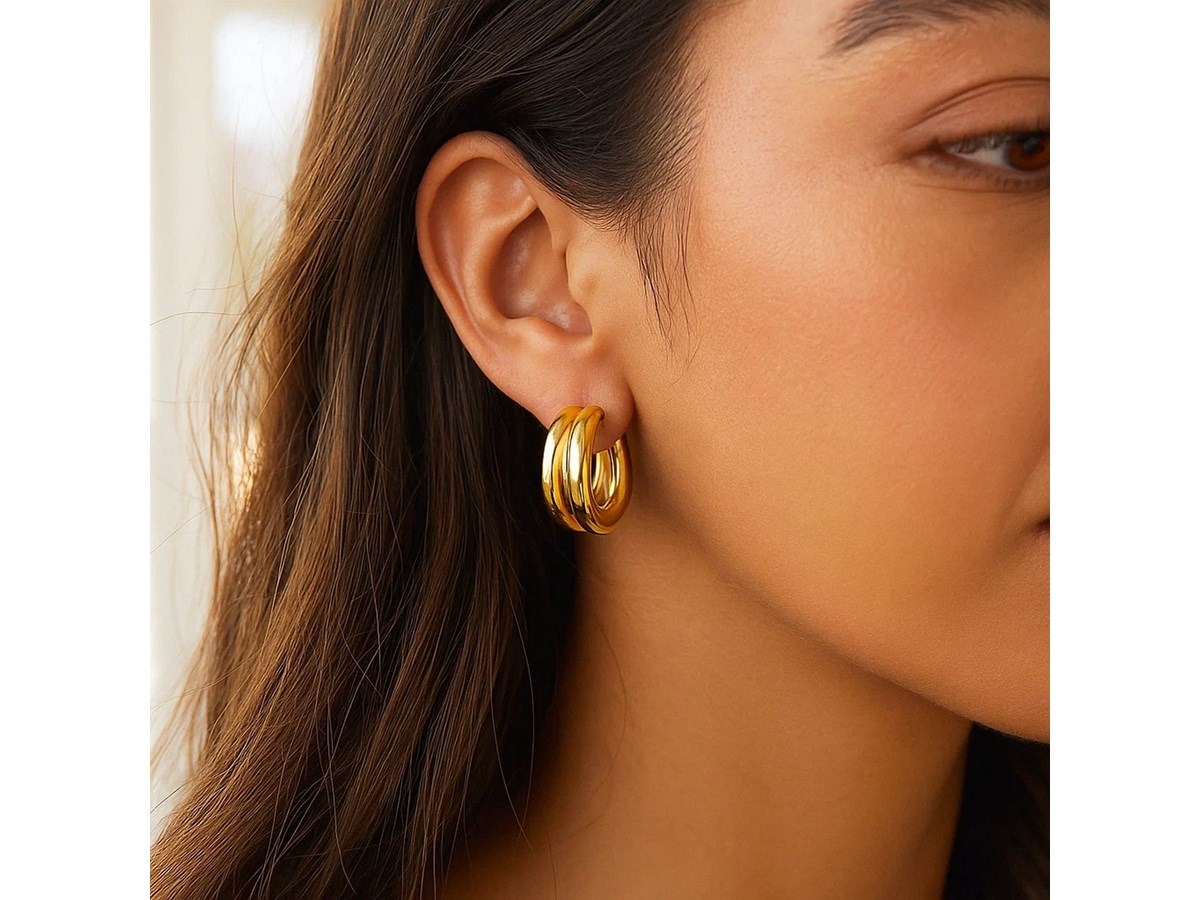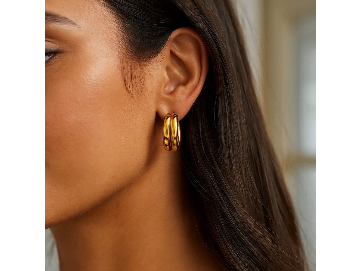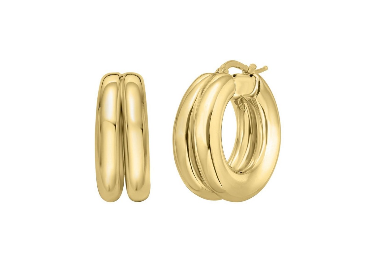 Chic sterling silver yellow gold plated puffed double row hoop earrings featuring a polished finish and bold, rounded design. The double row structure adds depth and shine, creating a timeless look that blends modern elegance with classic sophistication.