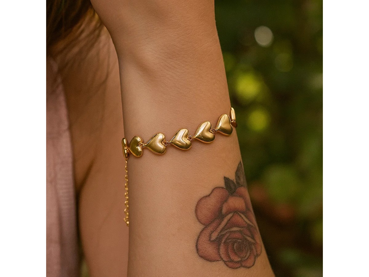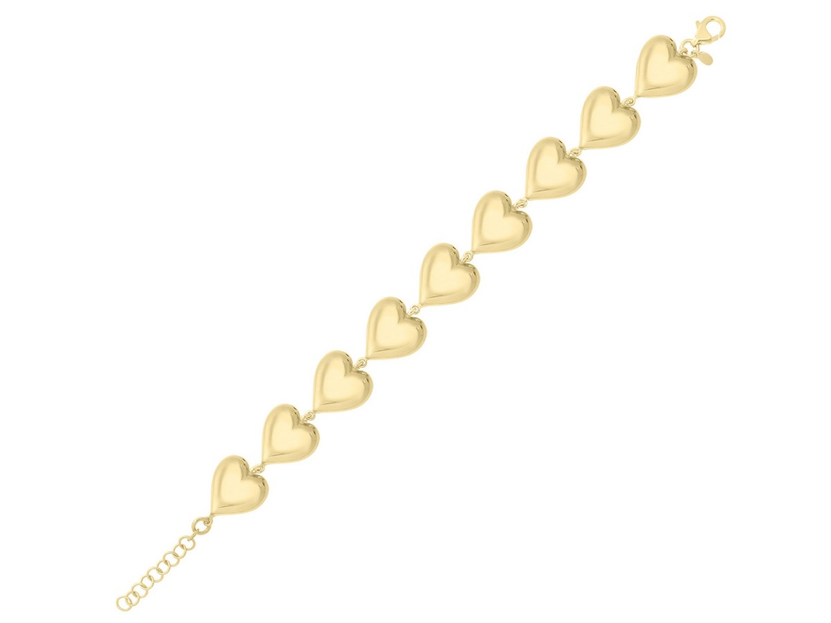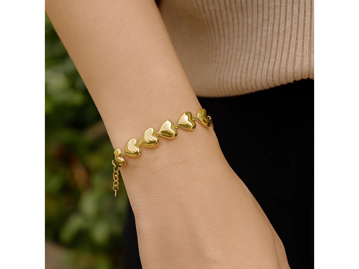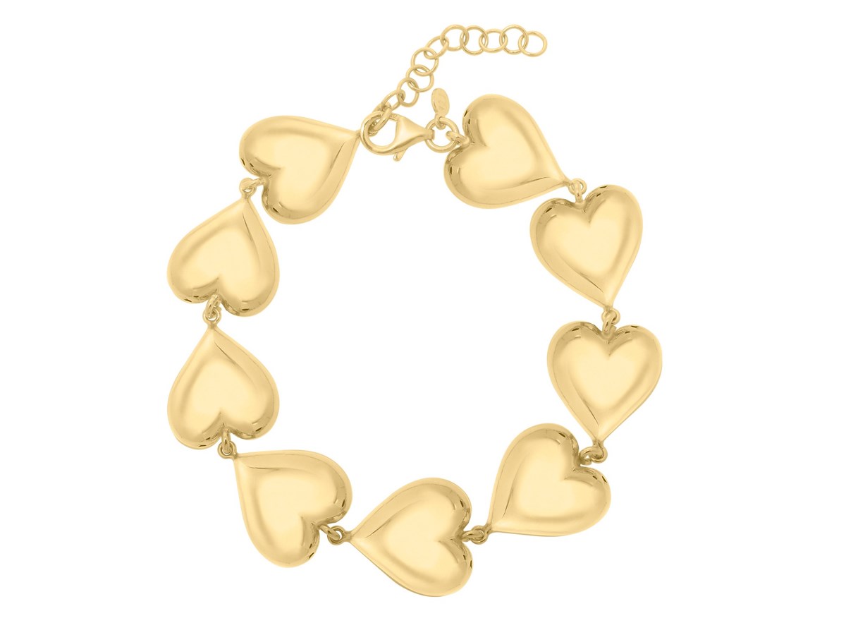 This sterling silver yellow gold plated puffed hearts bracelet features multiple polished, dimensional heart charms along a radiant chain. Its warm golden shine and romantic design make it perfect for everyday wear, layering, or gifting.