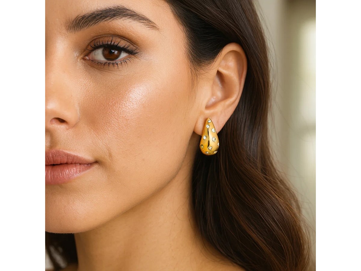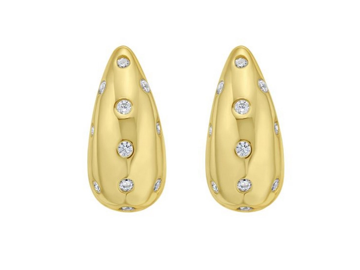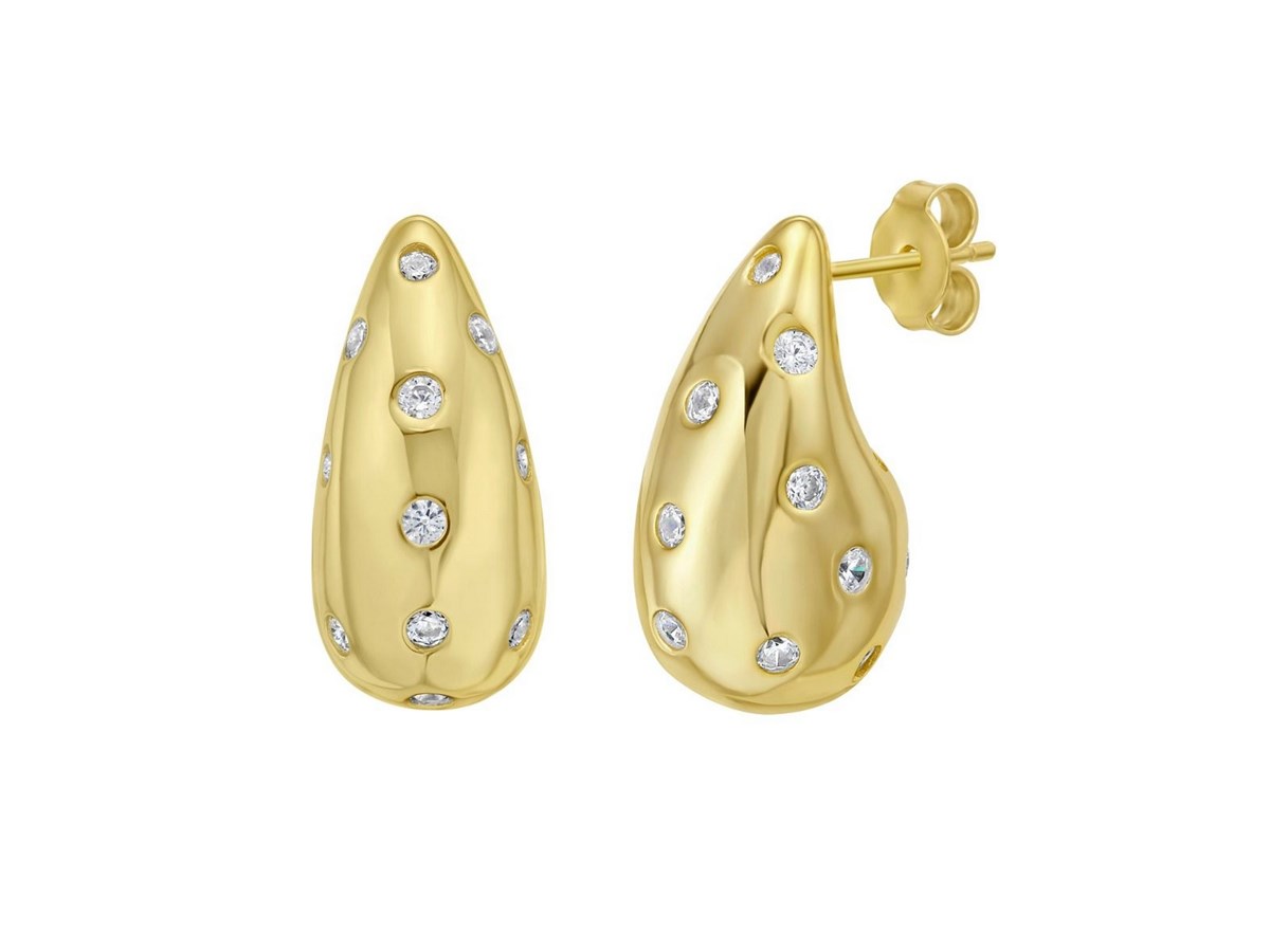 Elegant sterling silver yellow gold plated puffed raindrop CZ earrings featuring a smooth, rounded design accented with sparkling cubic zirconia. The golden hue adds warmth and radiance, creating a timeless look of sophistication and modern elegance.