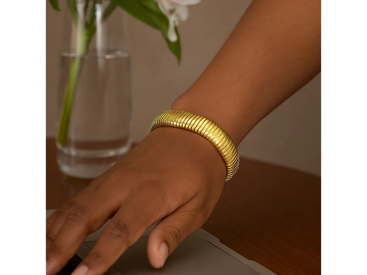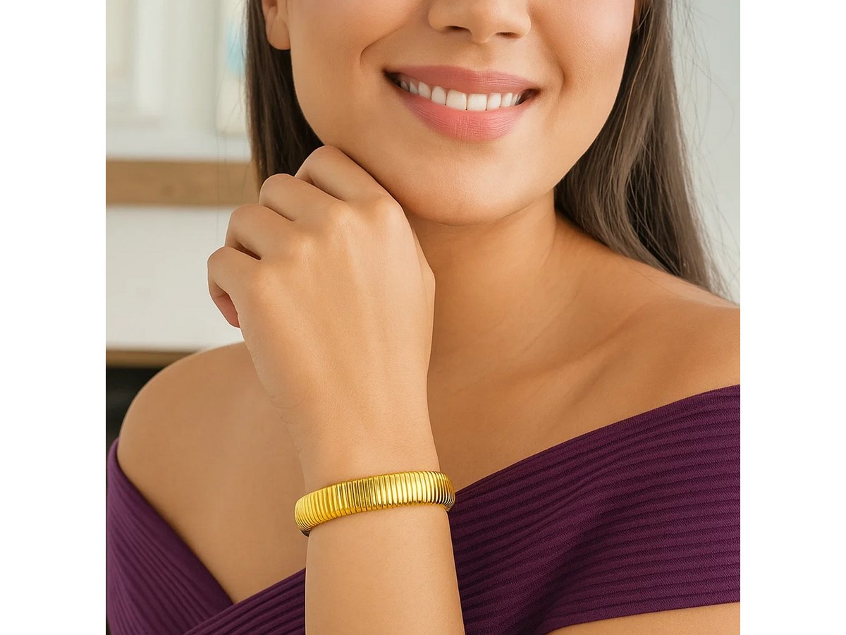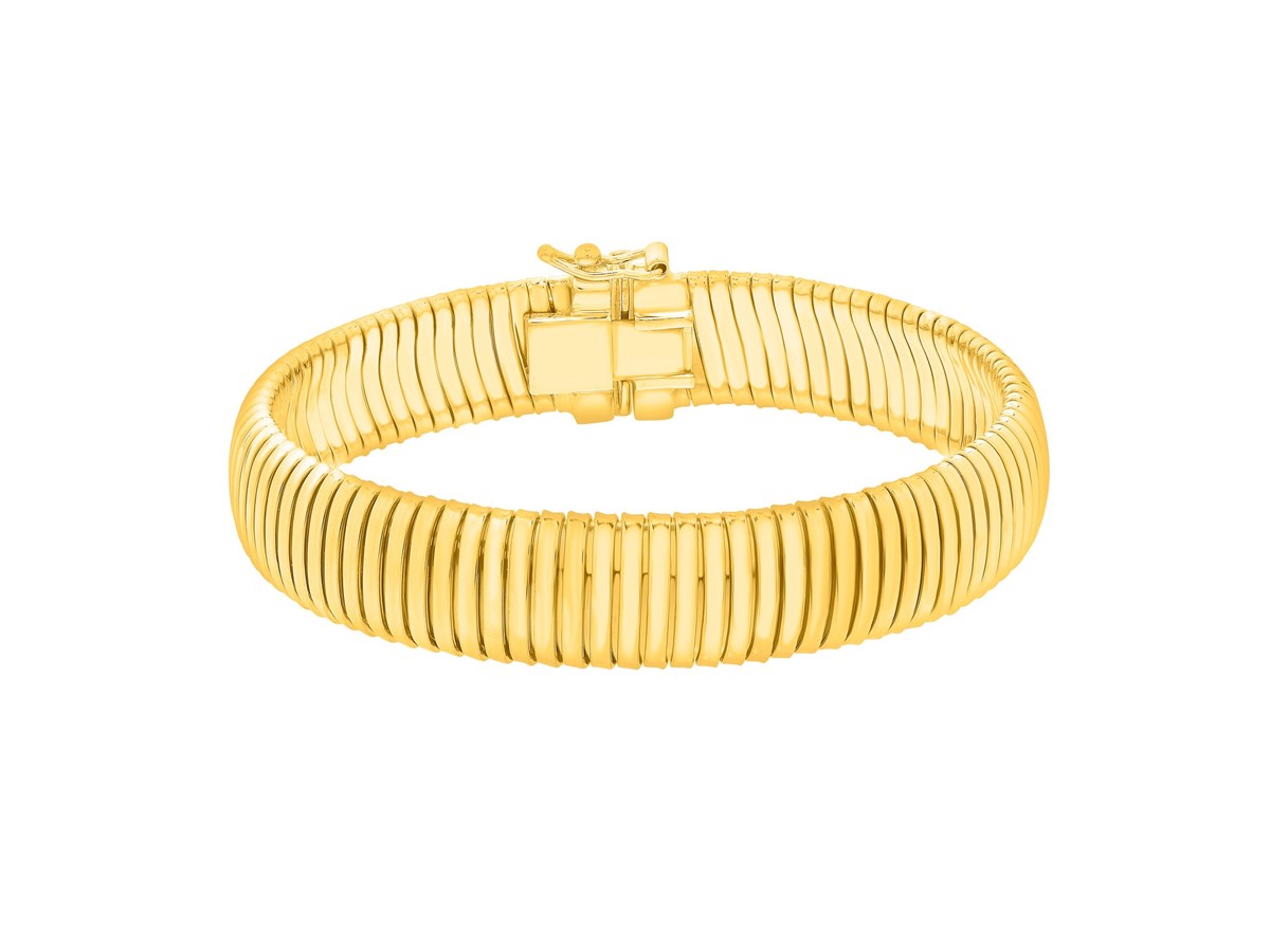 This sterling silver yellow gold plated Tubogas bracelet (12.00 mm) features a bold, flexible coil design with a smooth, high-shine finish. Its thick, modern profile makes a standout statement, perfect for elevating everyday looks or pairing with your favorite gold pieces.