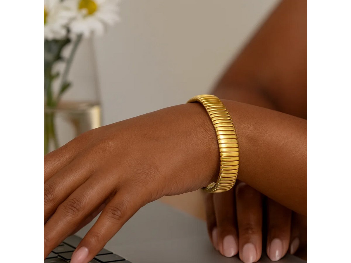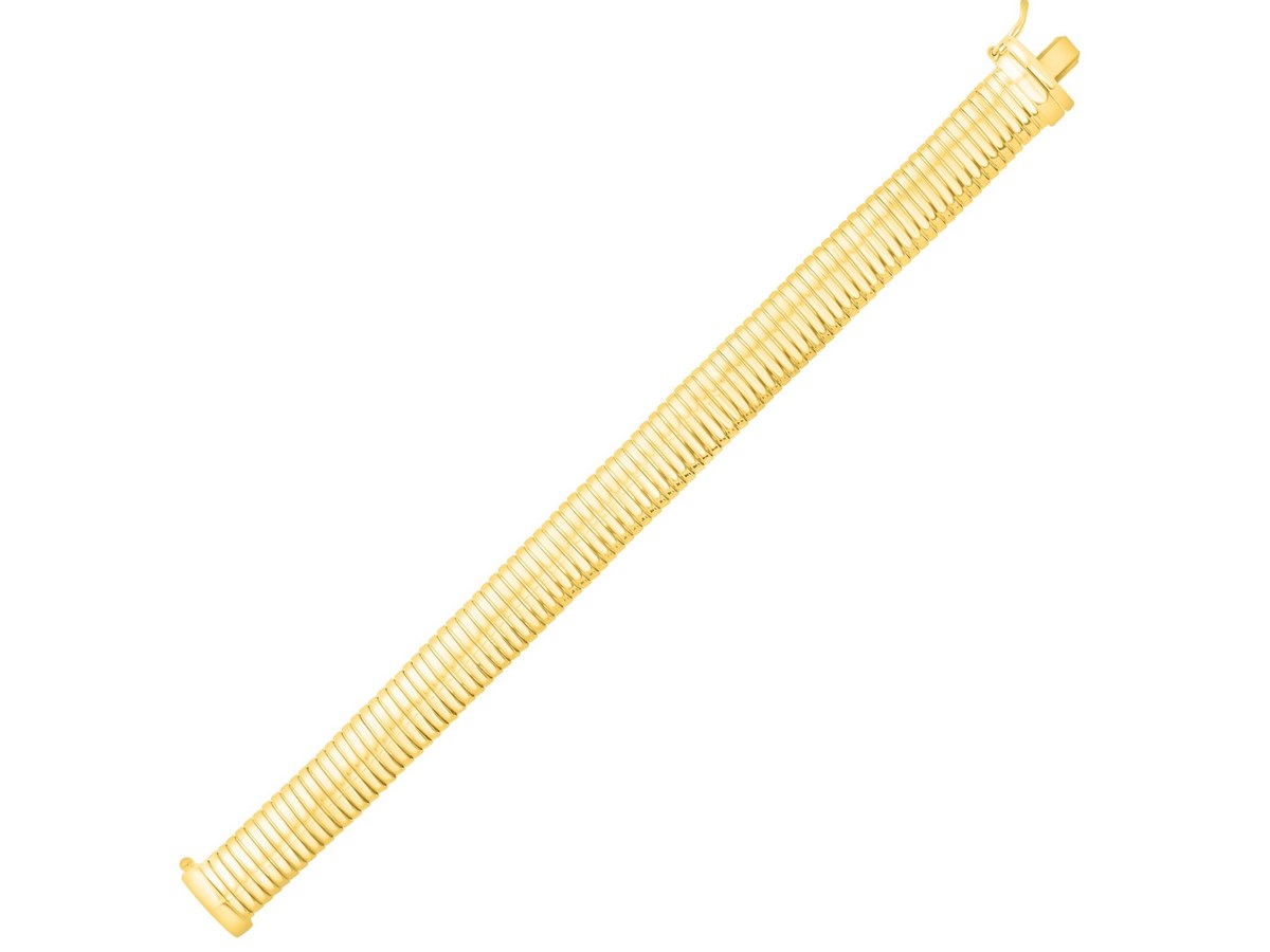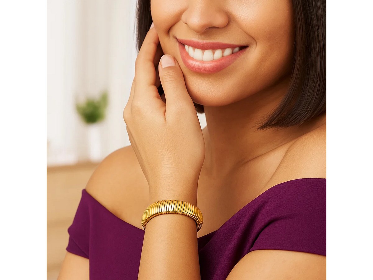 This sterling silver yellow gold plated Tubogas bracelet (12.00 mm) features a bold, flexible coil design with a smooth, high-shine finish. Its thick, modern profile makes a standout statement, perfect for elevating everyday looks or pairing with your favorite gold pieces.