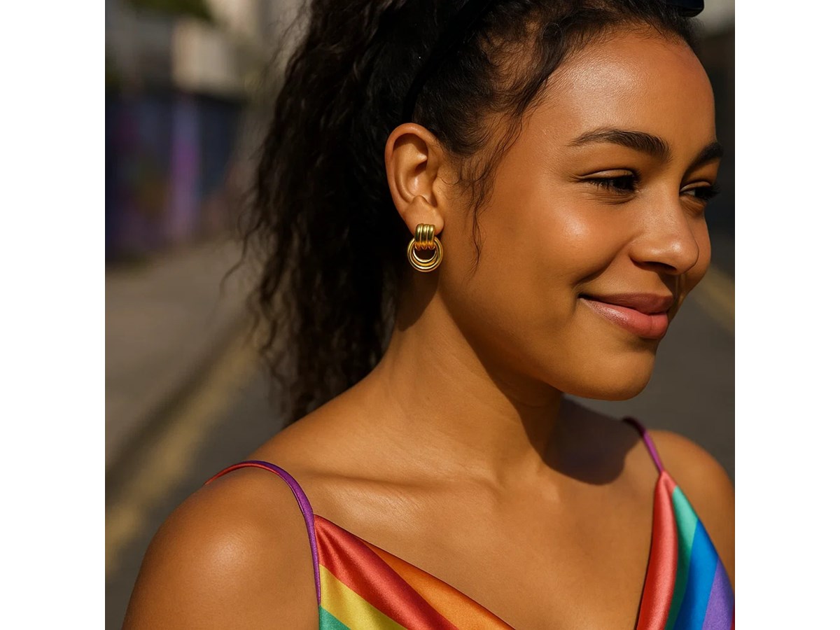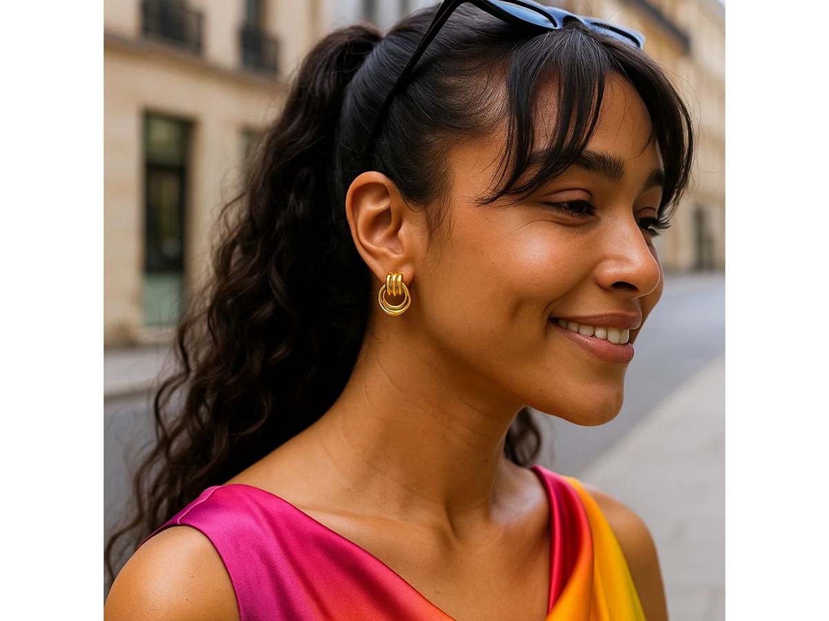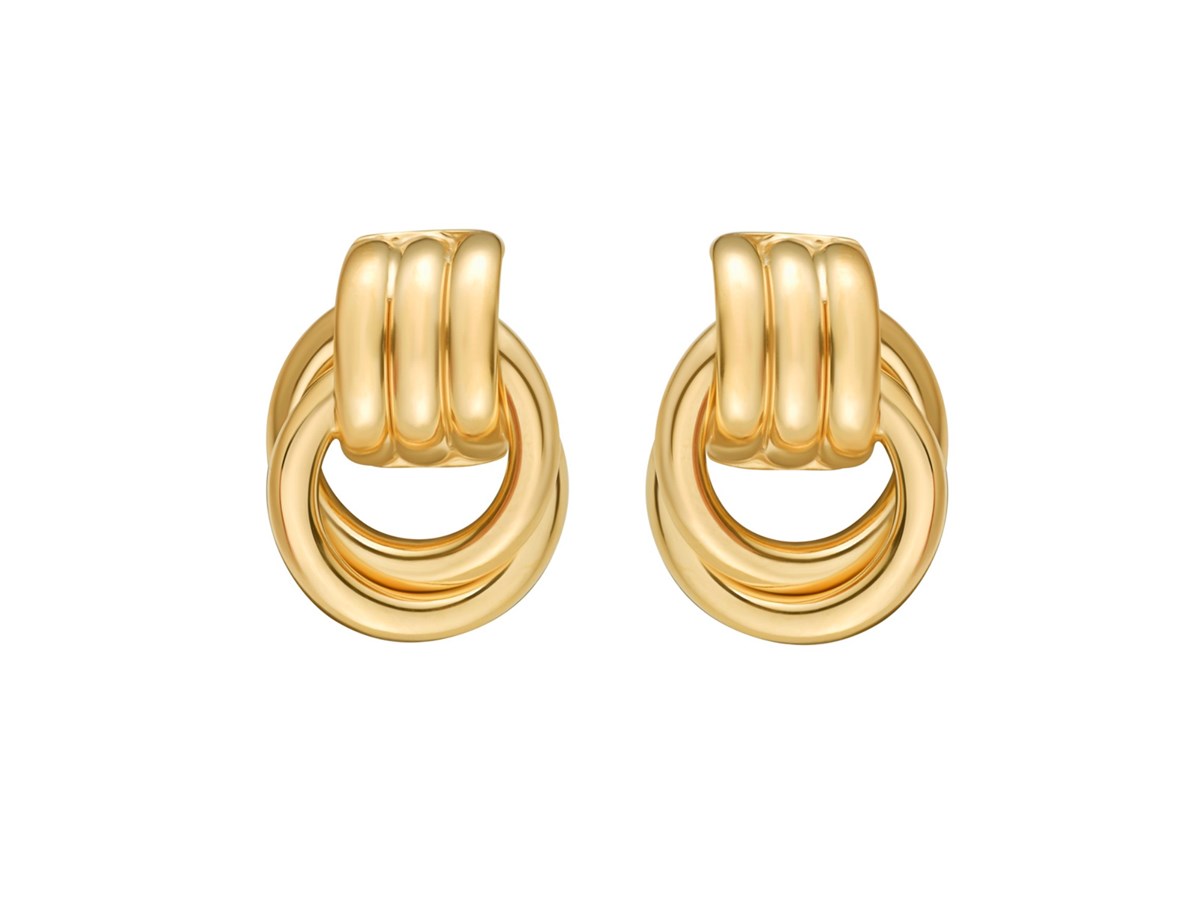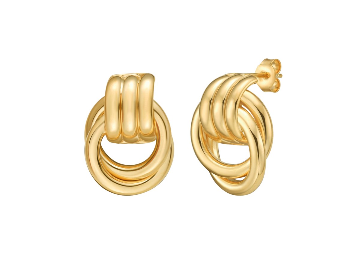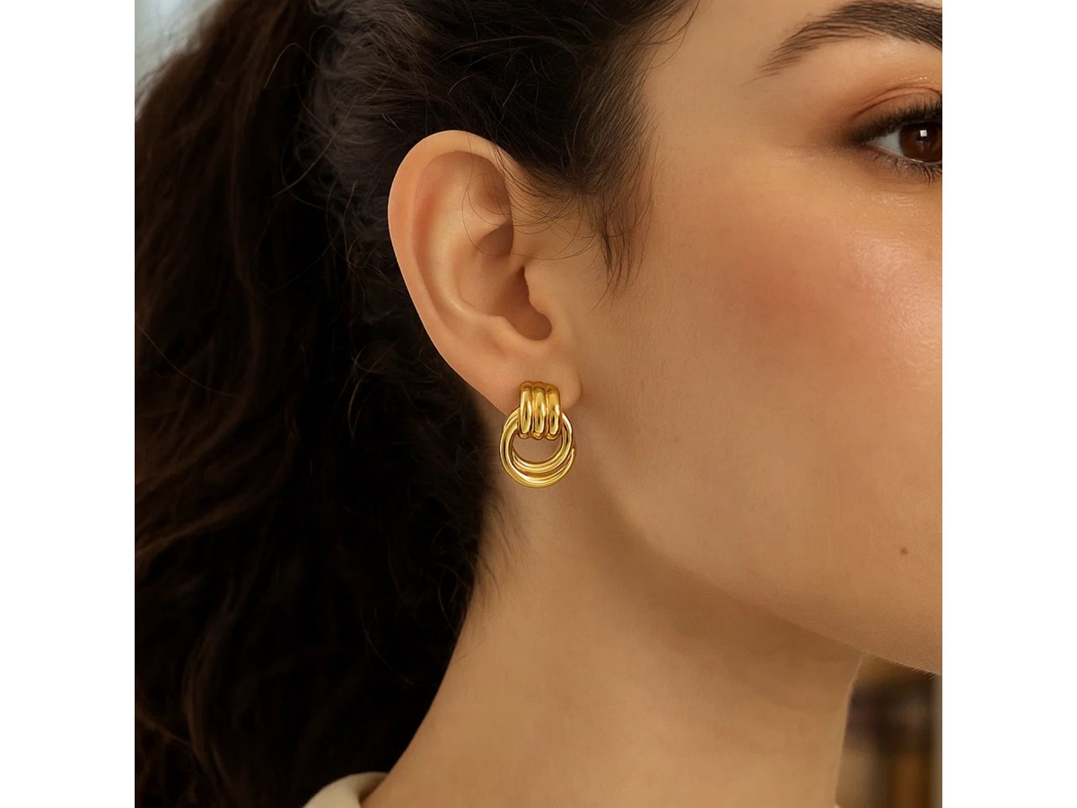 Elegant sterling silver yellow gold plated triple door knocker hoop earrings featuring a polished finish and graduated interlocking design. The layered hoops create depth and graceful movement, offering a bold yet refined look perfect for both everyday elegance and special occasions.