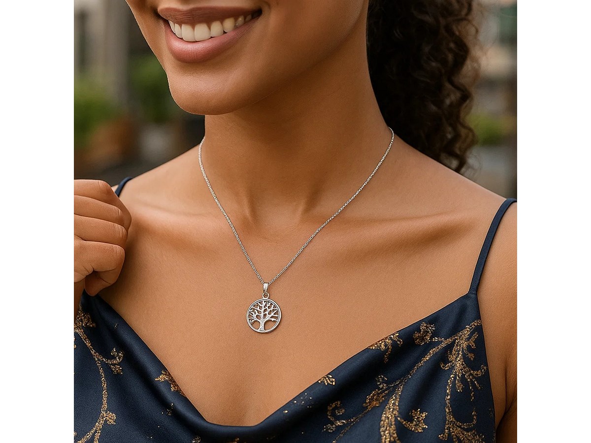A thoughtful Tree of Life symbol is the focus of this versatile and bright sterling silver necklace. Necklace is 18 inches long.