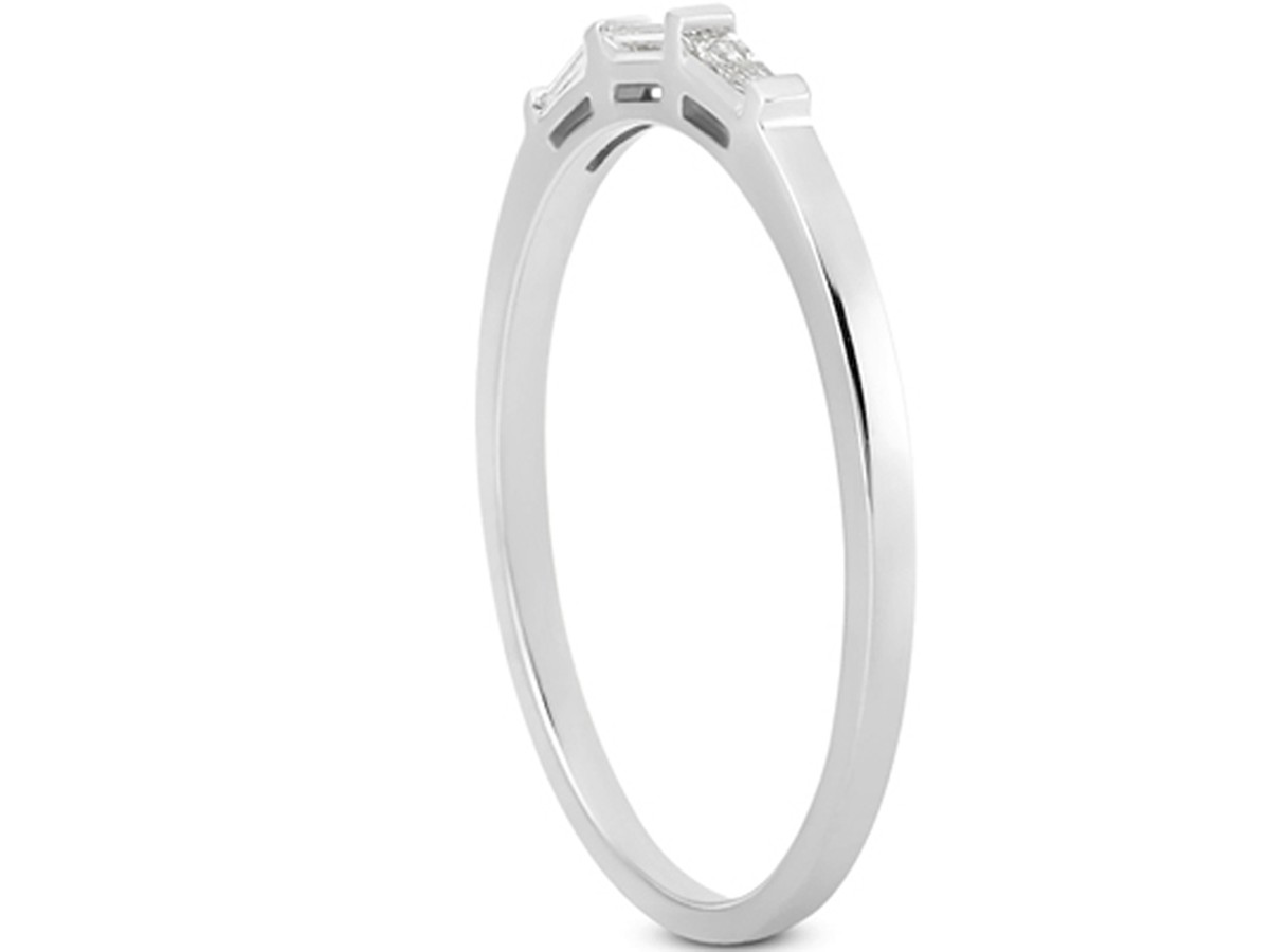 Tailored and streamlined, this expertly crafted 14K white gold slim wedding ring features three baguette diamonds. The straight baguette in the center is bordered on each side by a tapered baguette.