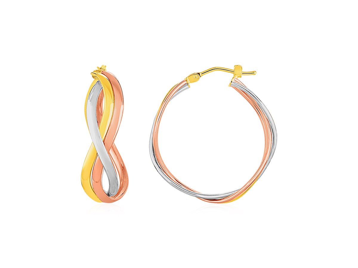 Three wavy circles of yellow, white, and rose gold combine in these beautiful and eye-catching round hoop earrings. Earrings are held in place with hinged clasps.