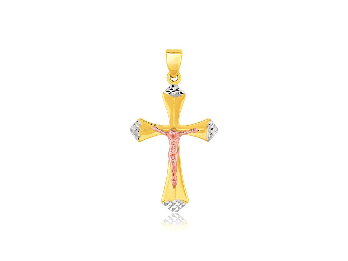 This cross pendant is crafted in 14K tri color gold.